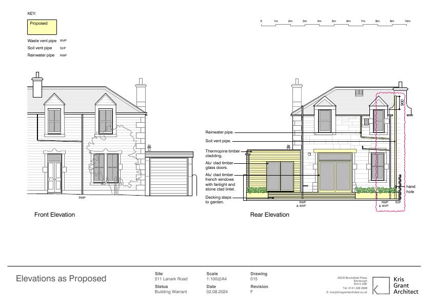 Non Material Variation - Under the approved Building Warrant amendment the Soil stack is to be moved to the right hand side of the bathroom window to assist in tidying up the redundant branches in the current system. The existing system is part PVC and part cast iron. As the new stack is to the rear of the property and adjacent property has PVC. The NMV request is to allow the use of PVC for the new Soil stack to be installed. There will be no other change. However I also propose repainting the entire above ground drainage in a UV resistant paint to ensure a uniform appearance. Location Drwg 23_01107_FUL-_01 Elevations Existing Drwg. 23_01107-_04 Proposed Elevation under approved Building Warrant amendment Drwg.015(F).