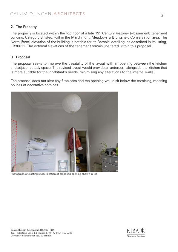Retrospective consent to cut doorway/opening in internal wall between kitchen and study in top-floor B-listed Marchmont tenement; no external changes, fireplaces or cornice touched. .