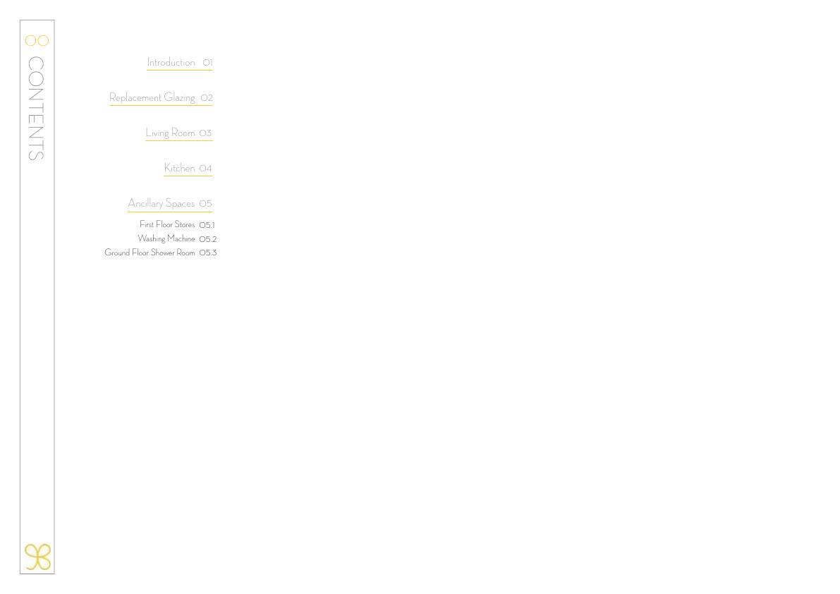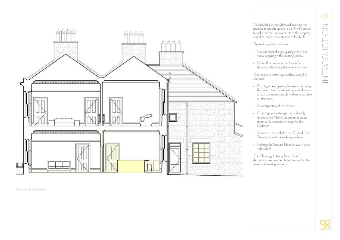 Minor alterations and upgrades comprising, replacement of single glazing with Fineo vacuum glazing within existing sashes, under floor insulation and underfloor heating to the living room and kitchen, a new opening between the living room and the kitchen with pocket doors, the reconfiguration of the kitchen and alterations to ancillary stores.