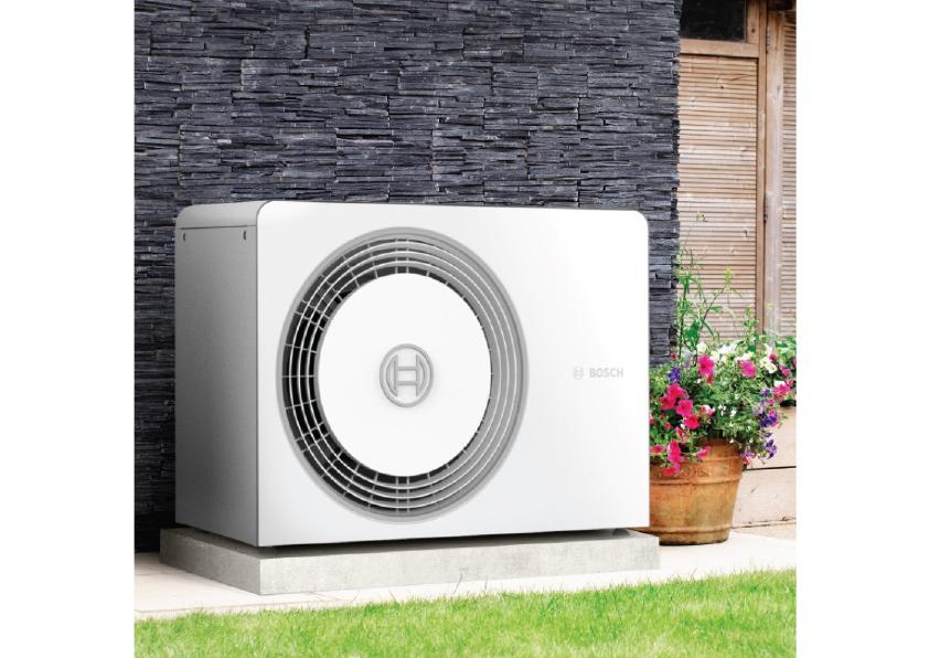 Installation of a domestic Bosch compress heat pump outdoor unit location with in the front garden area.