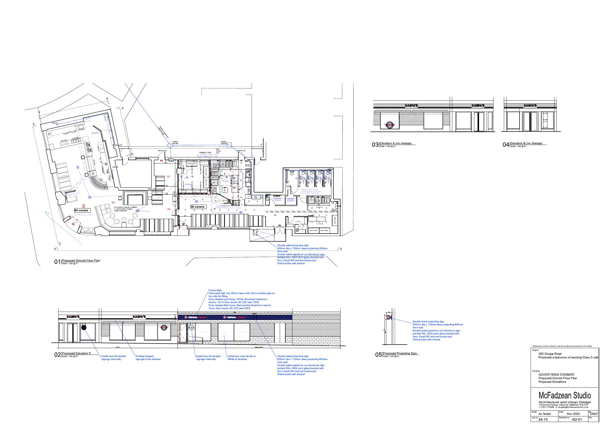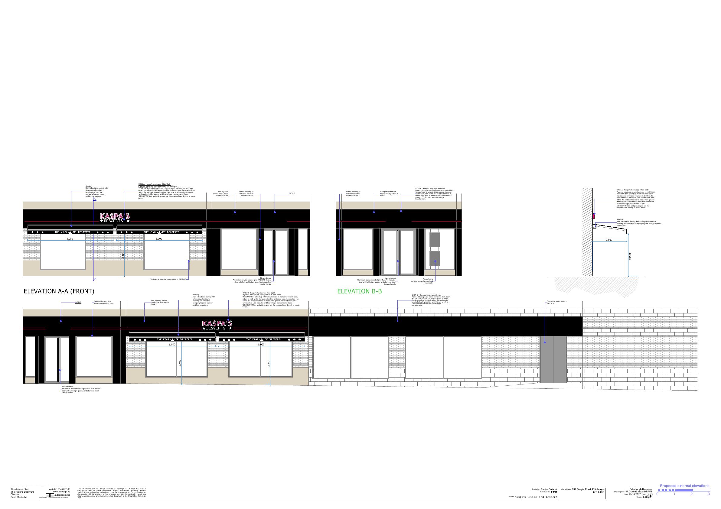 Install black aluminium fascia spanning full shopfront with pink-lit Kaspas lettering and one slim projecting sign at 392 Gorgie Rds newly split Class 3 unit. .