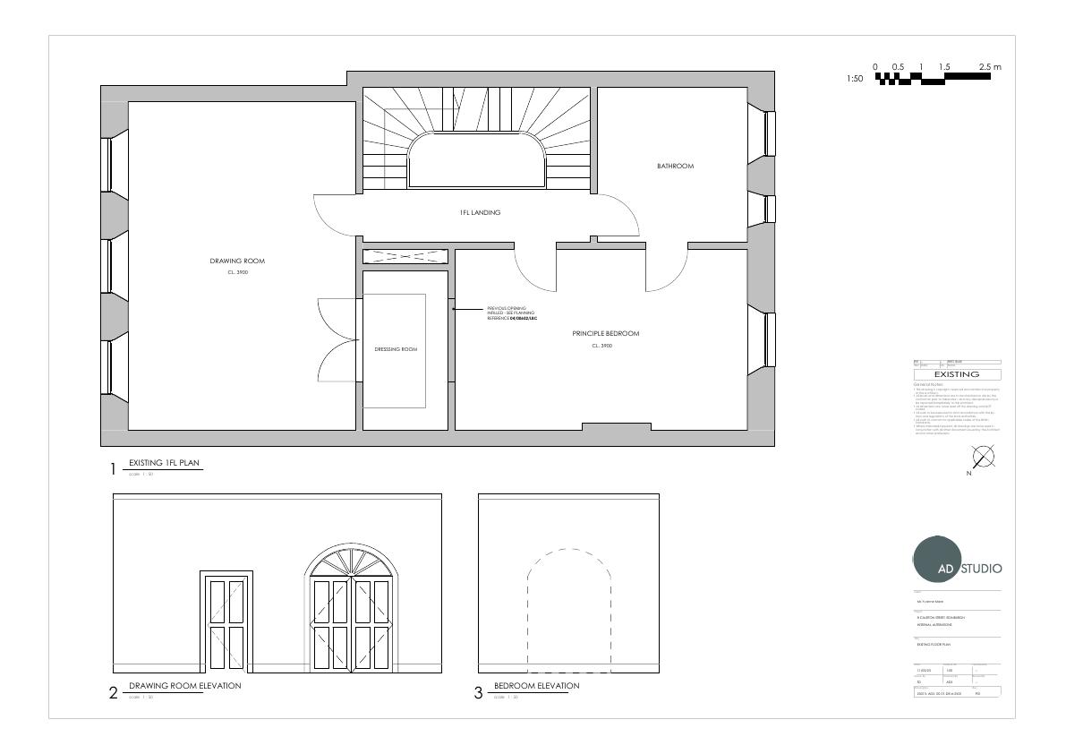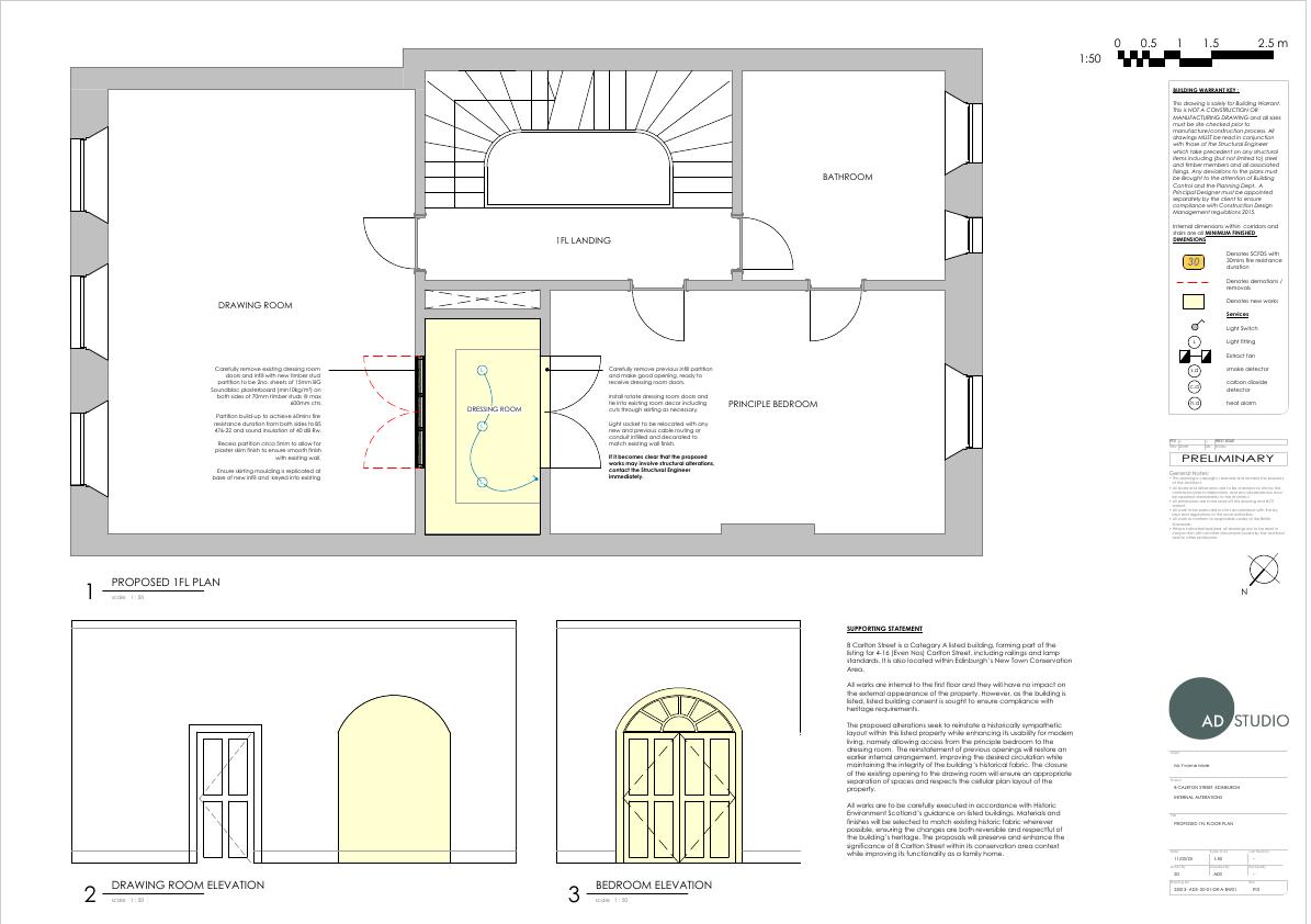 Listed townhouse tweak: block drawing-room doorway and add arched double doors from principal bedroom to dressing room; all works confined to first-floor interiors. .