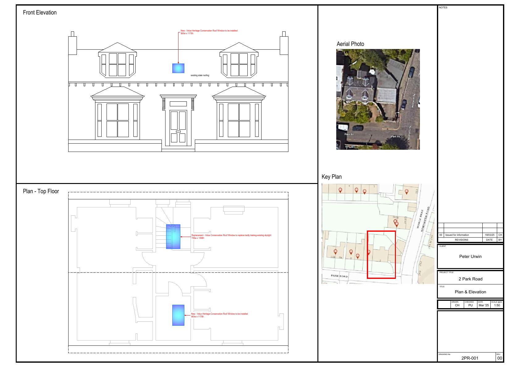 Front elevation gains a heritage Velux rooflight; rear skylight replaced like-for-like on the single cottage at 2 Park Road, preserving roofline with minimal visual impact. .