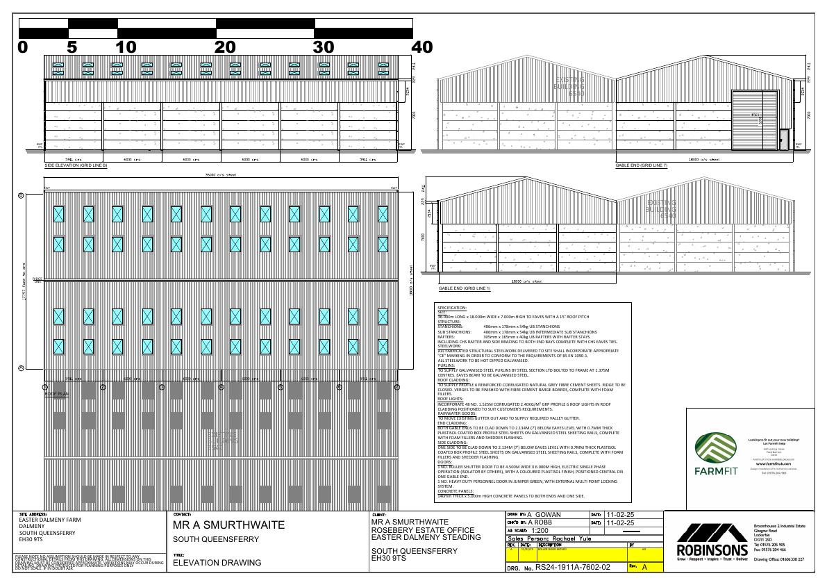 36 m 18 m steel-clad grain store beside Easter Dalmeny steading; 7 m eaves, ridge vents and concrete floor add 648 m covered capacity with minimal landscape change.