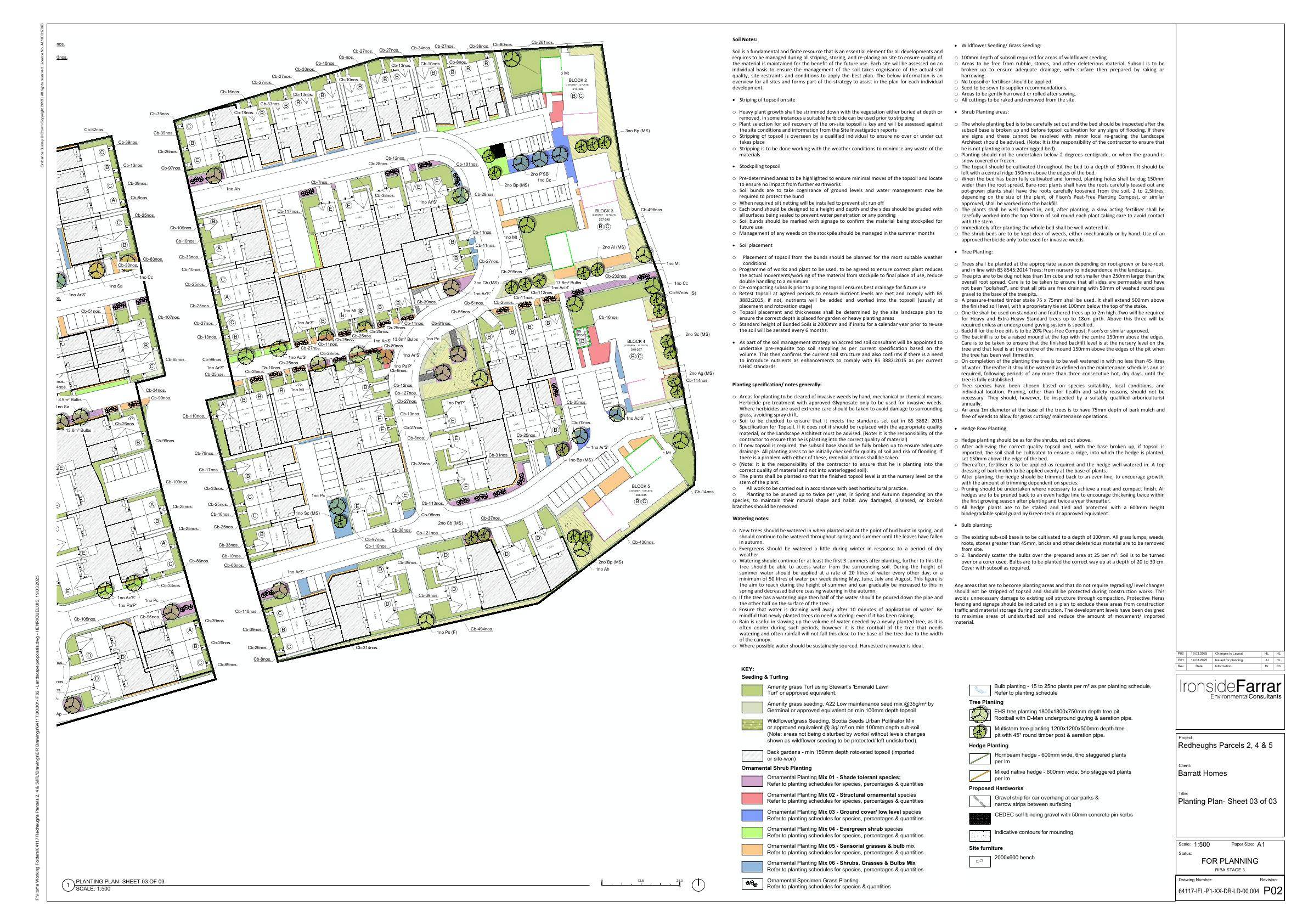 Planting, tree-work and maintenance details for parcels 8 & 9 at Redheughs Village, creating green corridors and public open space within the wider housing scheme. .