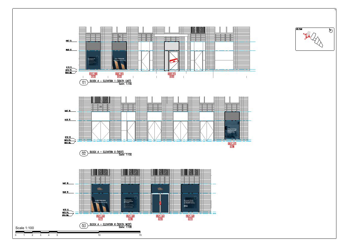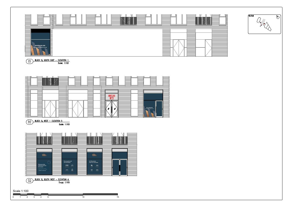 Applied vinyls on ground-floor glazing of Blocks A-B at Dockside, Ocean Drive, to advertise forthcoming lettings; no structural changes, just branded panels and door graphics. .
