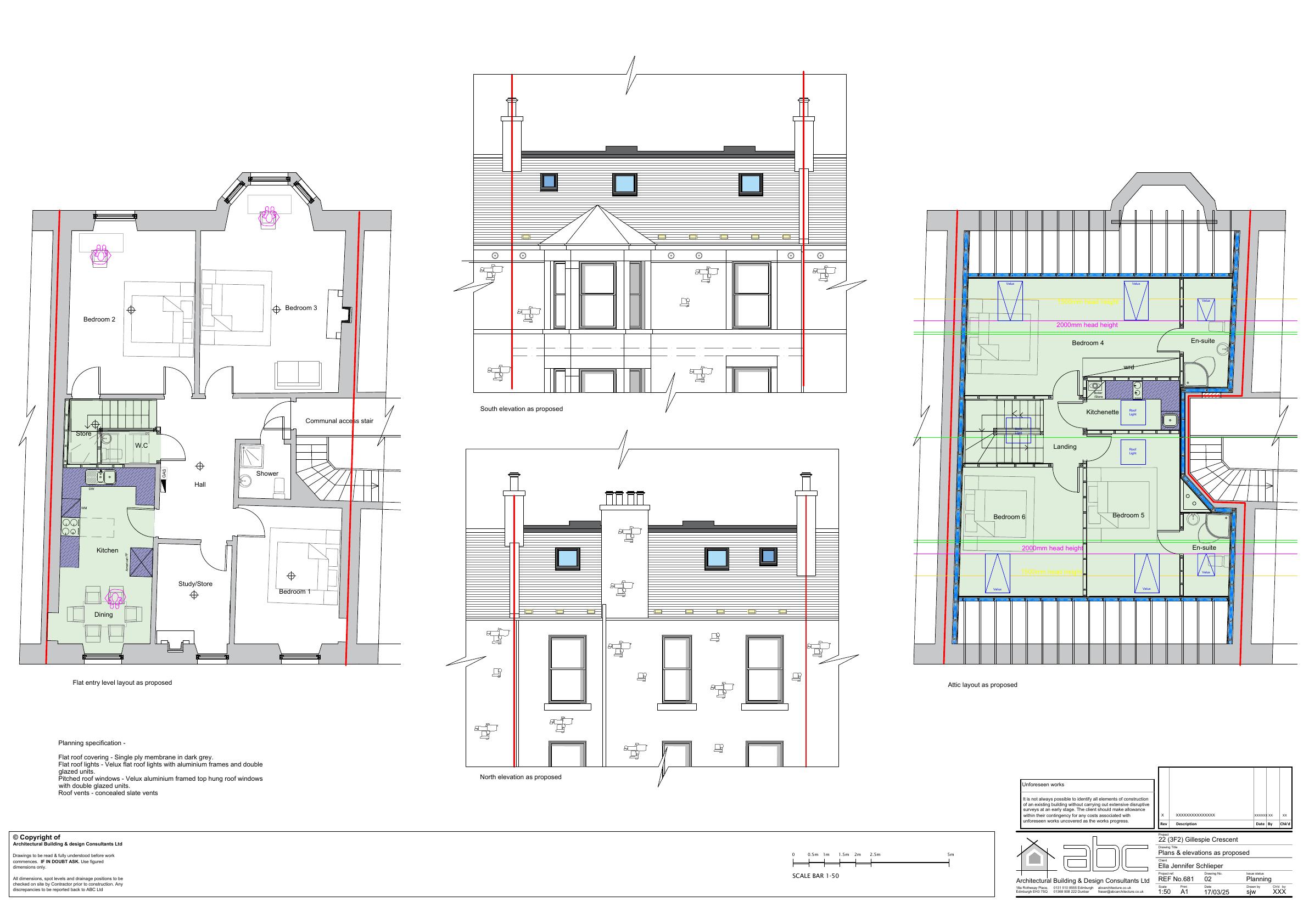 Top-floor flat on Gillespie Crescent to be reconfigured into a six-bed HMO; attic fitted with rooflights, layout reshuffled for extra bedrooms and shared spaces, external change limited to new roof openings. .