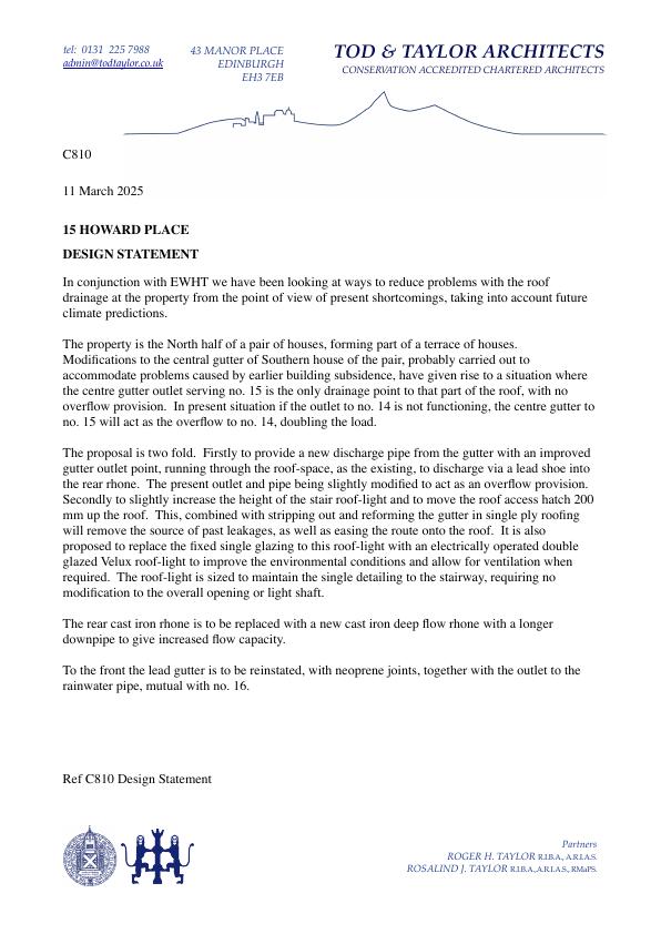 To improve the buildings response to climate change by improving discharge from the internal gutter and by increasing the height of the stair roof light base to raise it further above the gutter, and to replace the present fixed stair rooflight with a matching size electrically operated velux unit, allowing for ventilation when required. To raise the roof access hatch up the roof slope. To restore the front gutter lining to lead.