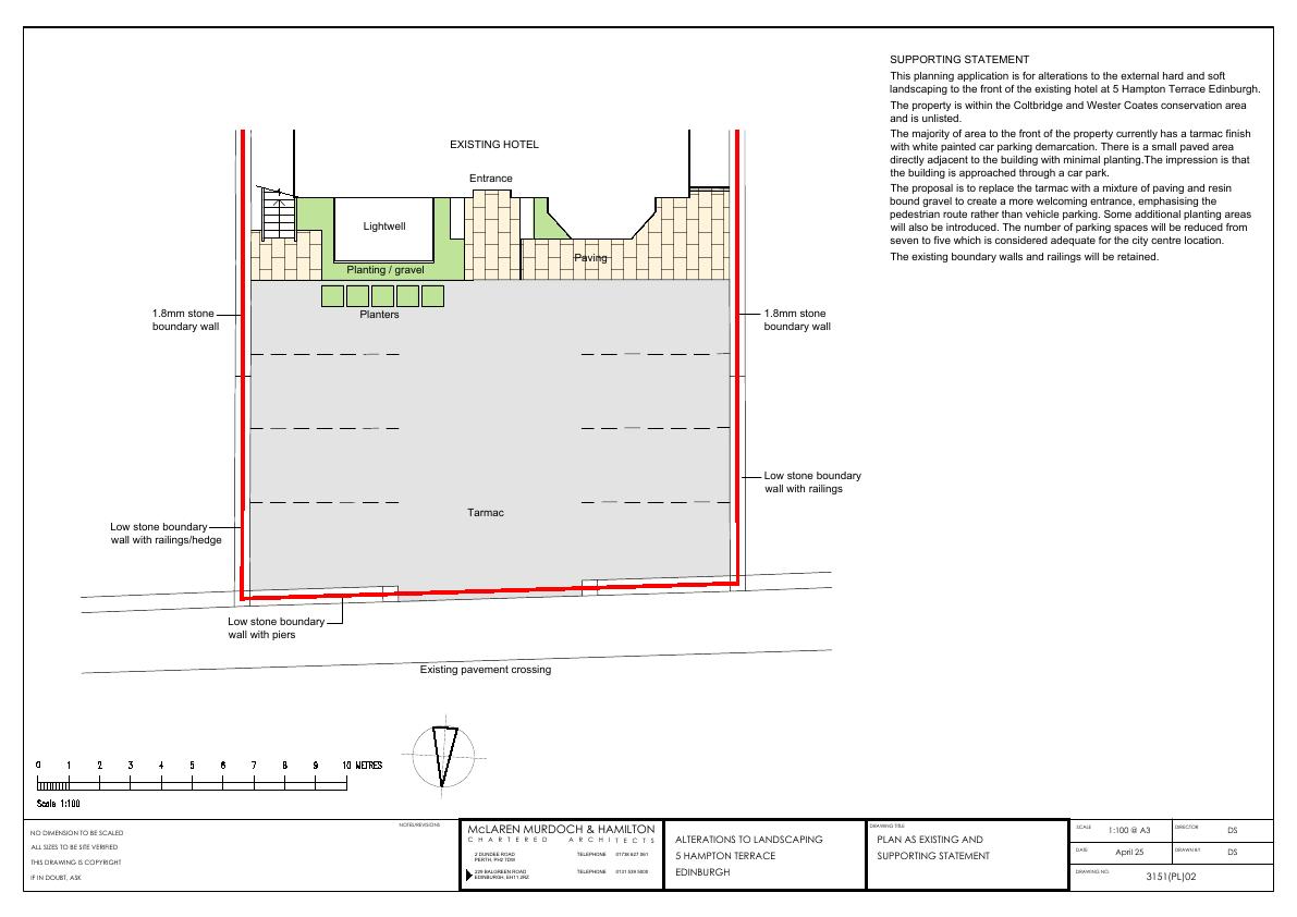 Front-of-hotel upgrade replaces tarmac car park with paved/resin surfaces, cuts spaces from 7 to 5, introduces planters and greenery, retains existing stone boundary walls and railings.
