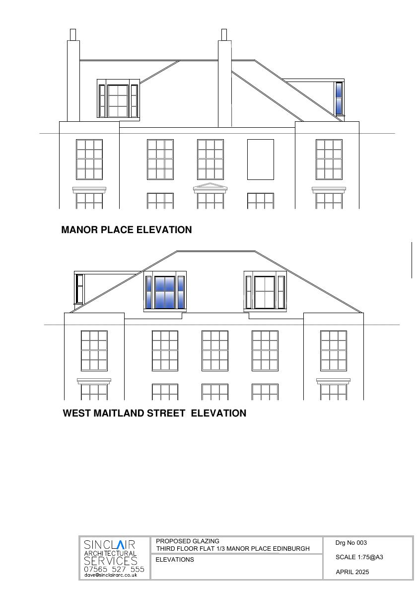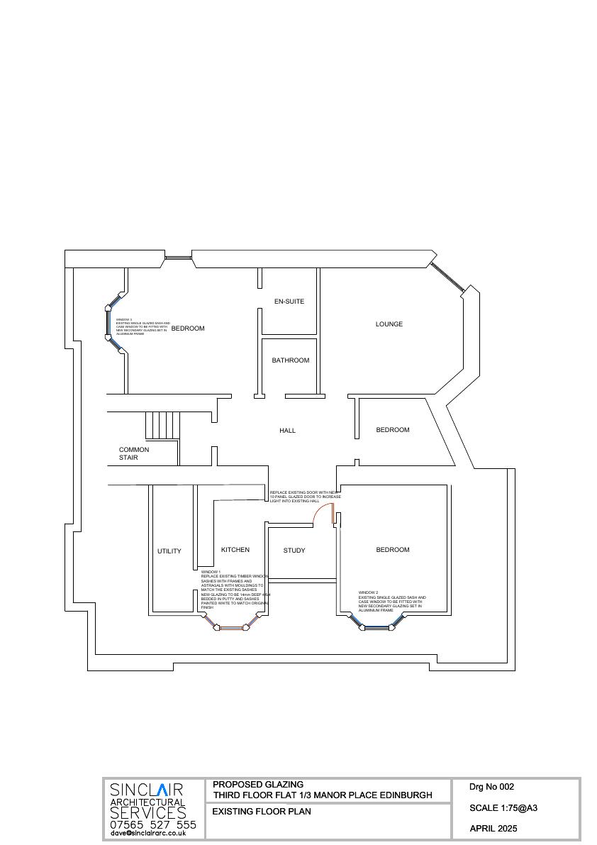 Timber sash replacements matching originals, secondary glazing on two windows and a new 10-pane glazed door for the third-floor flat at 1/3 Manor Place; minimal external change.