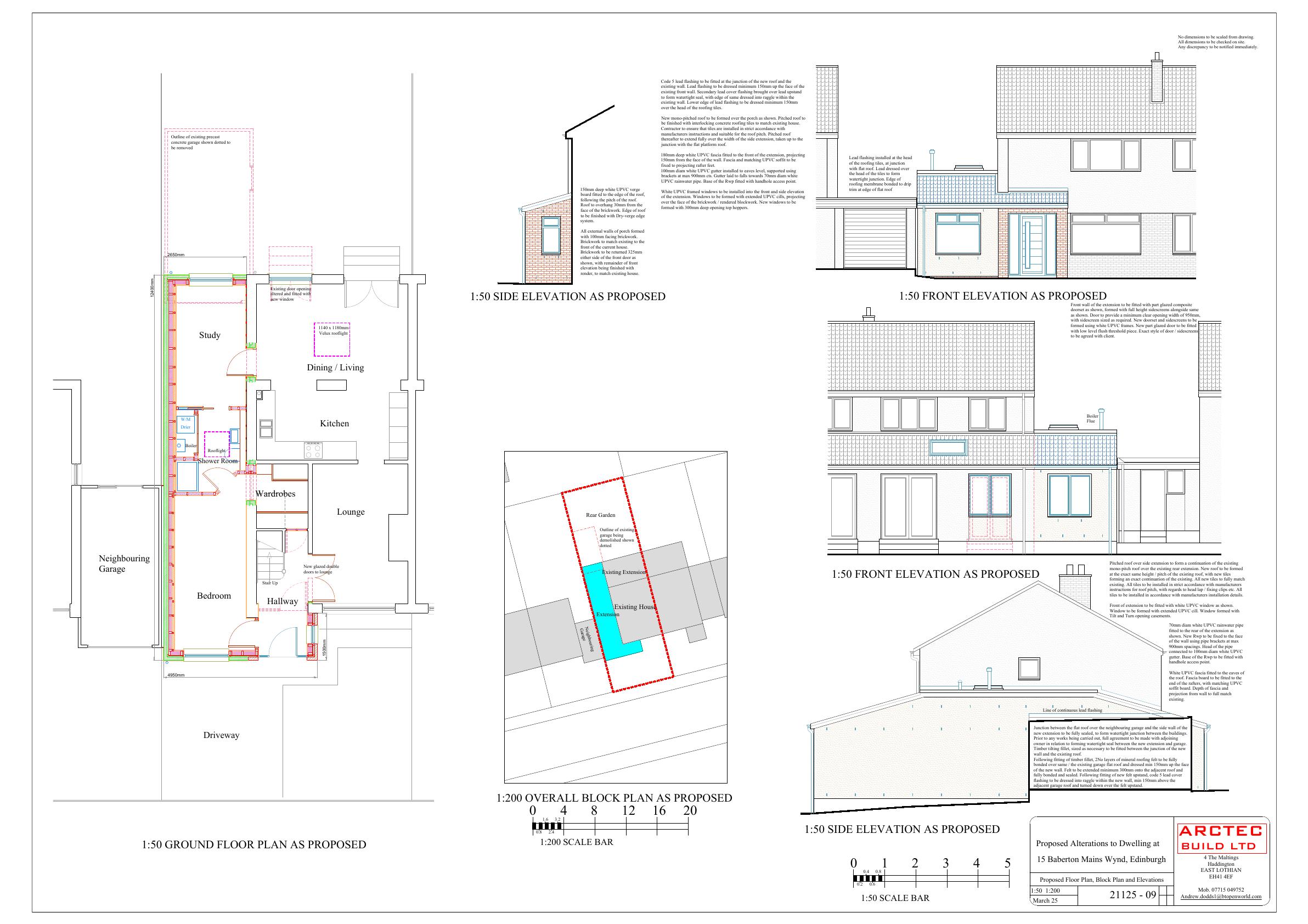 Demolish rear garage; add full-depth single-storey side extension projecting to front for porch, creating new bedroom and study; fit rooflight to rear roof, replace rear doors with window. .