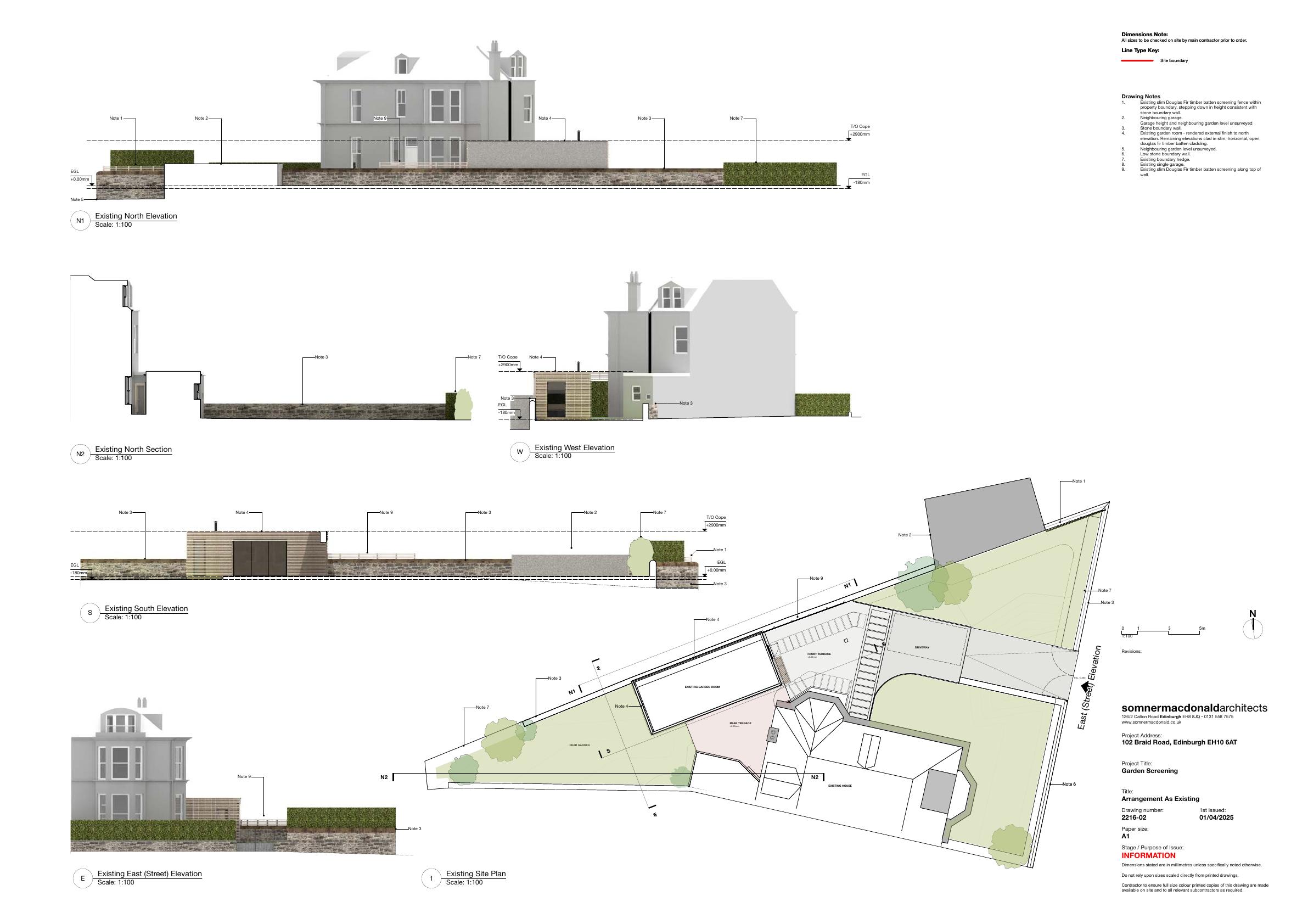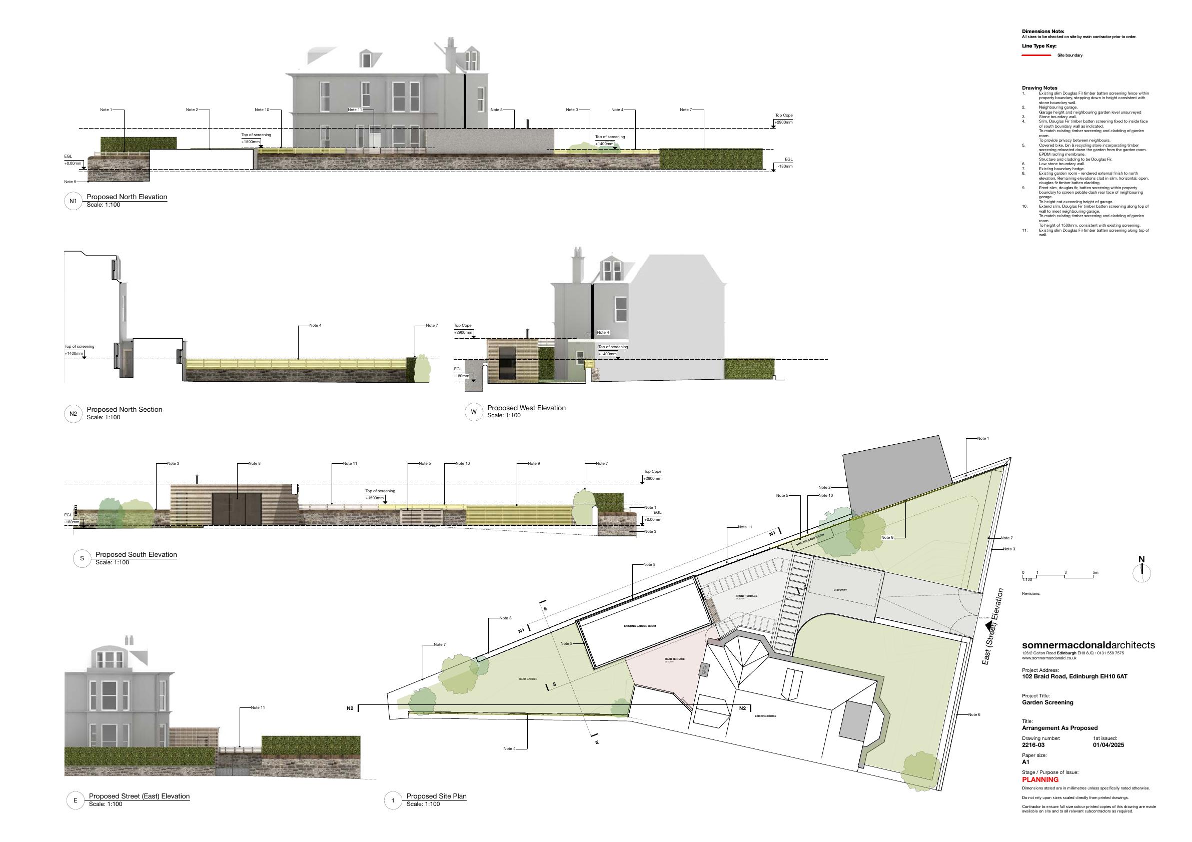 Slim timber-batten screens along rear and side garden at 102 Braid Rd, sitting just above existing stone wall to improve privacy without altering streetscape. .