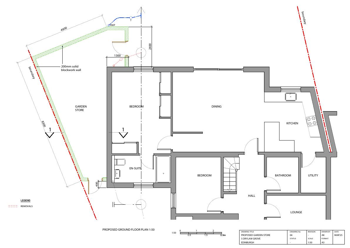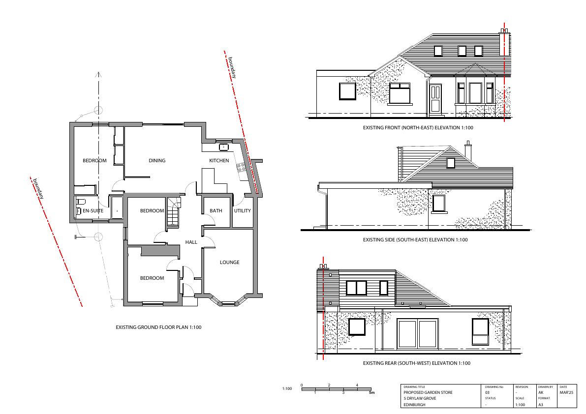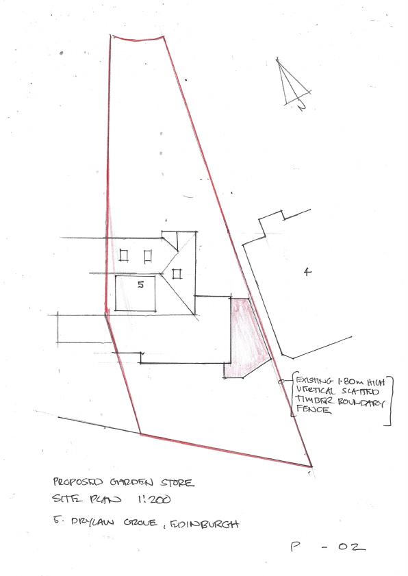 At 5 Drylaw Grove a 15 m, single-storey garden store will attach to the houses west flank, tucked behind 1.8 m fence; unchanged roofline, materials to match, negligible street impact. .