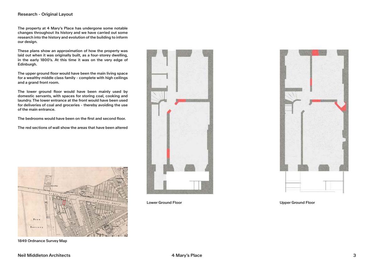 4 Marys Place flat reshapes ground floorbedroom moved, larger open-plan kitchen-diner created, original front door reinstated, one rear window cill lowered; no extension or demolition. .