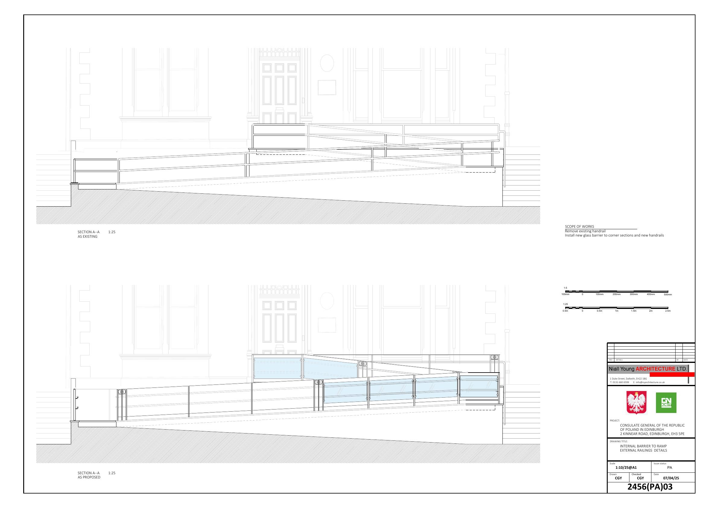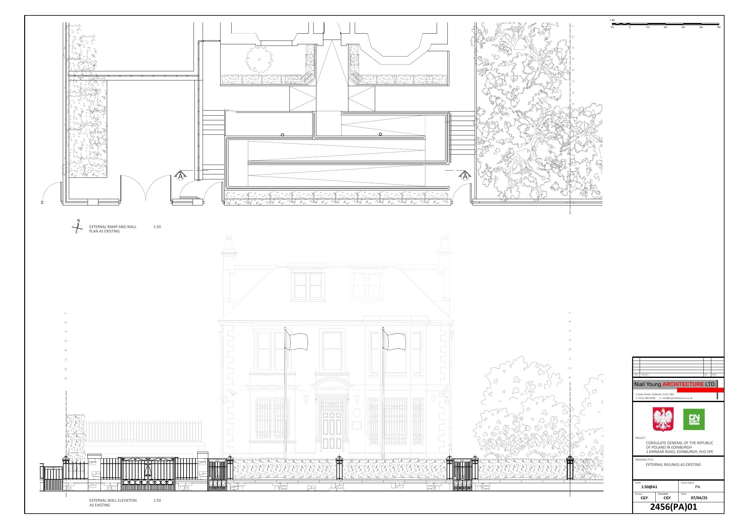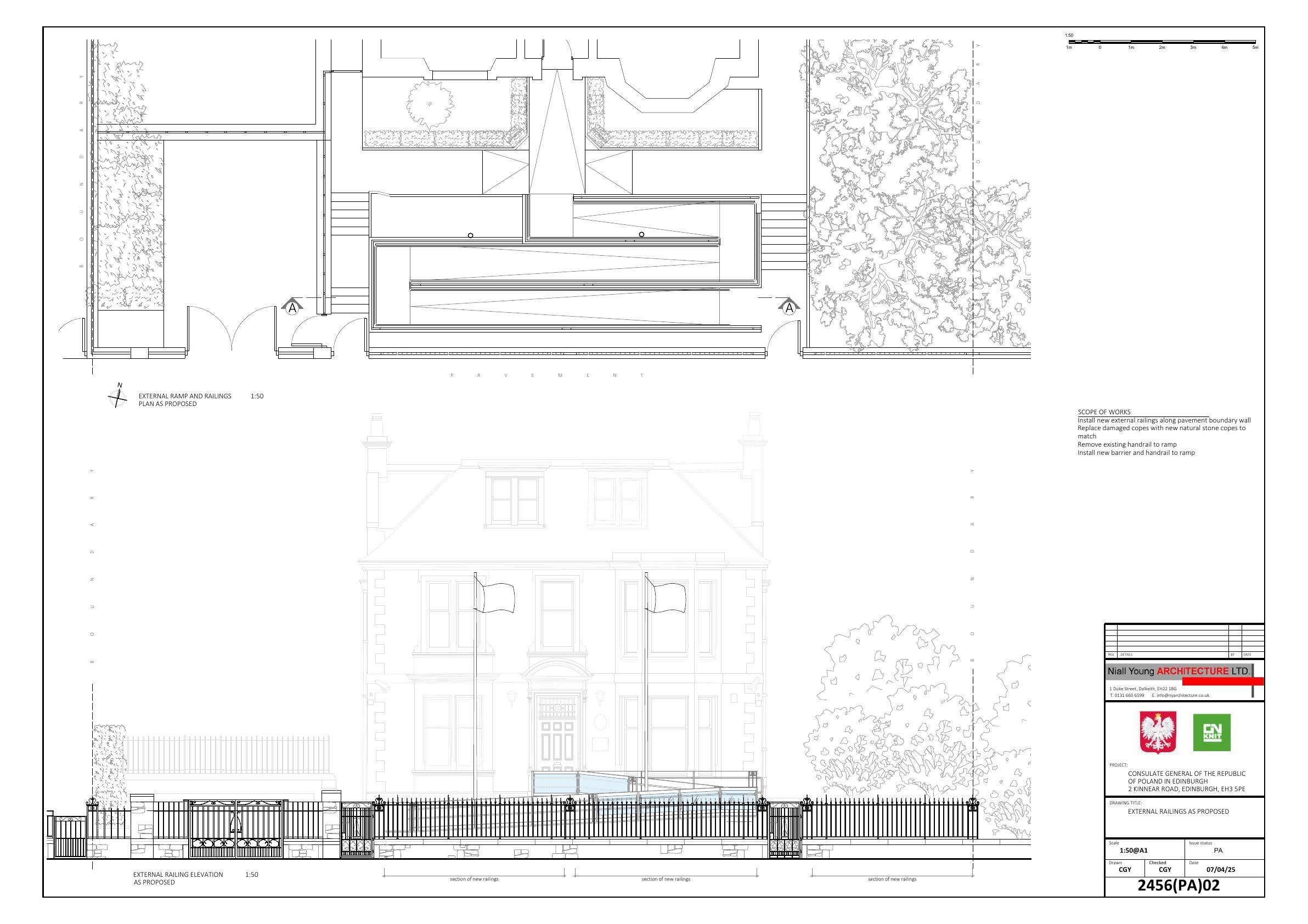 New metal railings on south boundary wall plus sleek glazed handrails to entrance ramp, replacing old rails and coping stones to boost security and accessibility at the consulates single building. .