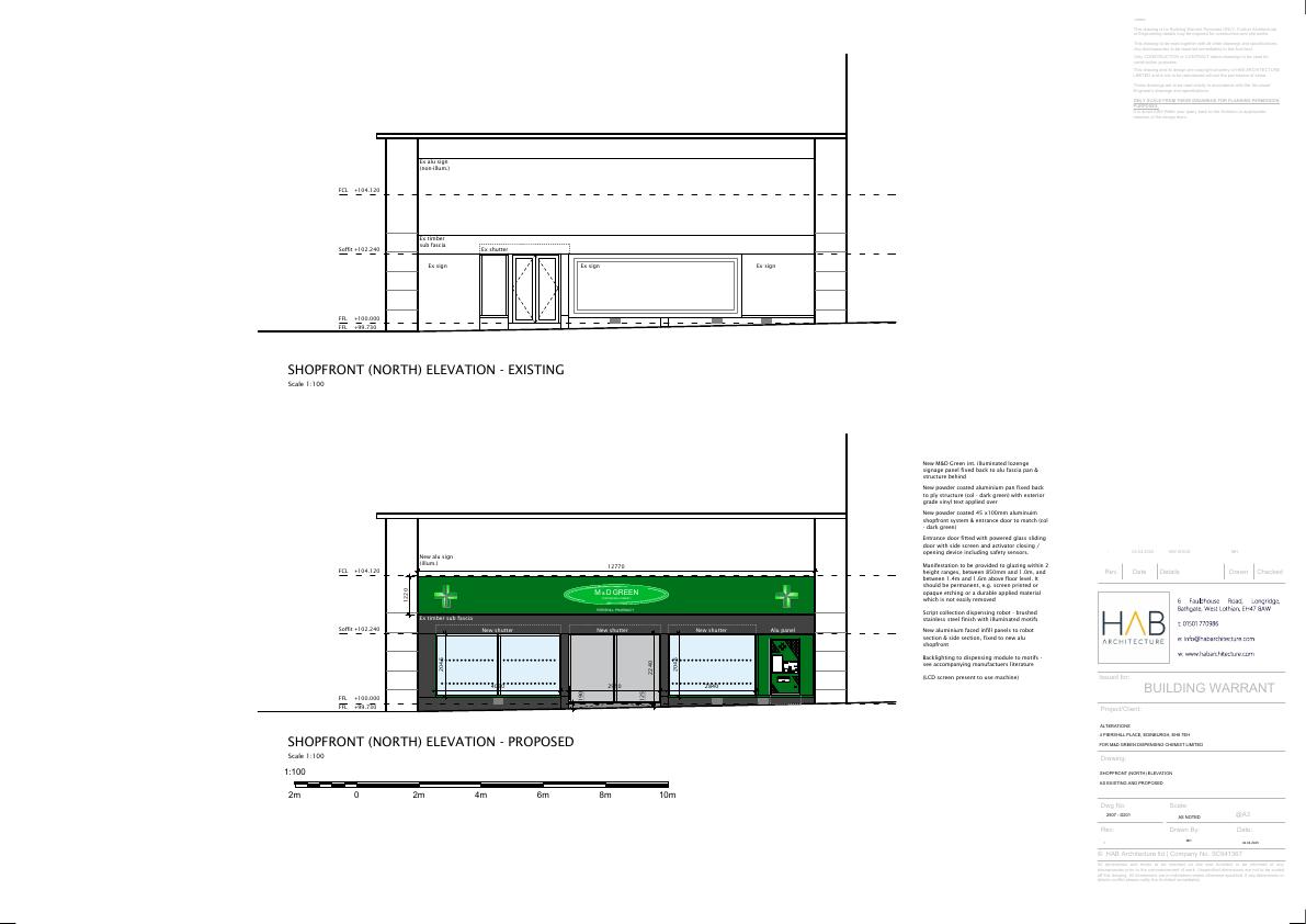 Reconfigure ground-floor retail unit into full-service pharmacy: new glazed shopfront, internal treatment rooms, dispensaries, stores and an external script-dispensing machine; footprint untouched. .