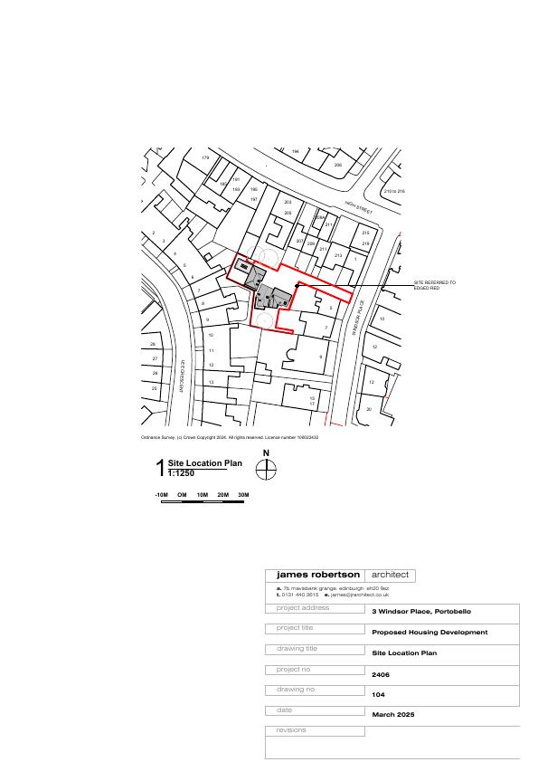 Clears outdated 1960s single-storey workshops to erect three two-storey brick mews homes around a shared courtyard, adding parking and landscaping within Portobello Conservation Area. .