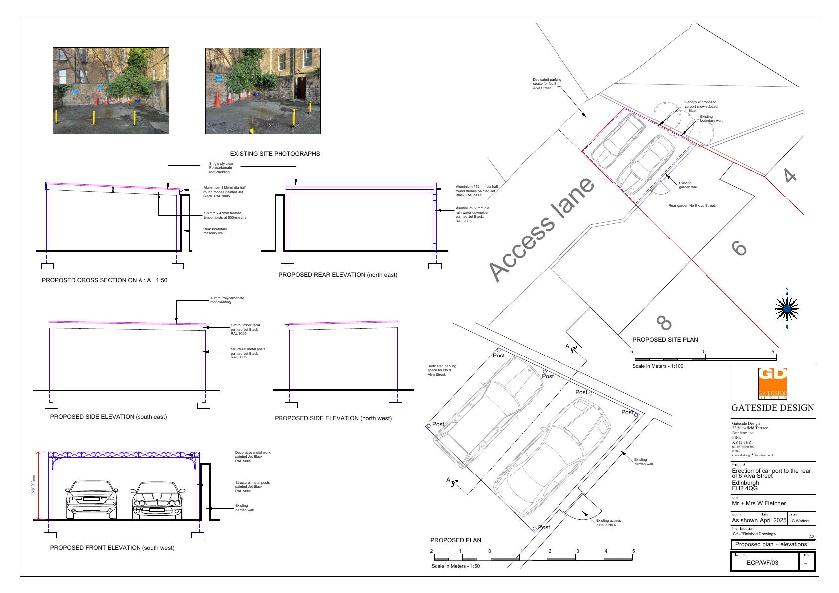 Rear of 6 Alva St: slim steel-post, polycarbonate-roof carport for two cars within garden, off access lane; open-sided, 2.35 m high, existing walls and trees retained. .