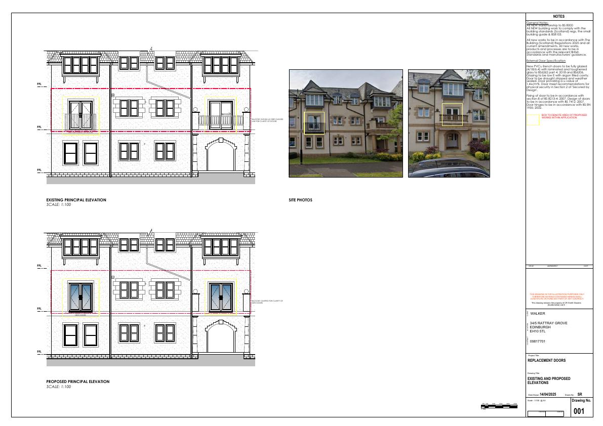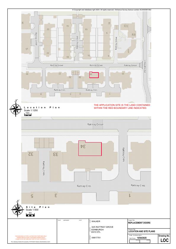 Swap two first-floor timber French/patio doors at Flat 34, Rattray Grove, for grey PVC-u glazed French sets; no structural change to block faade.