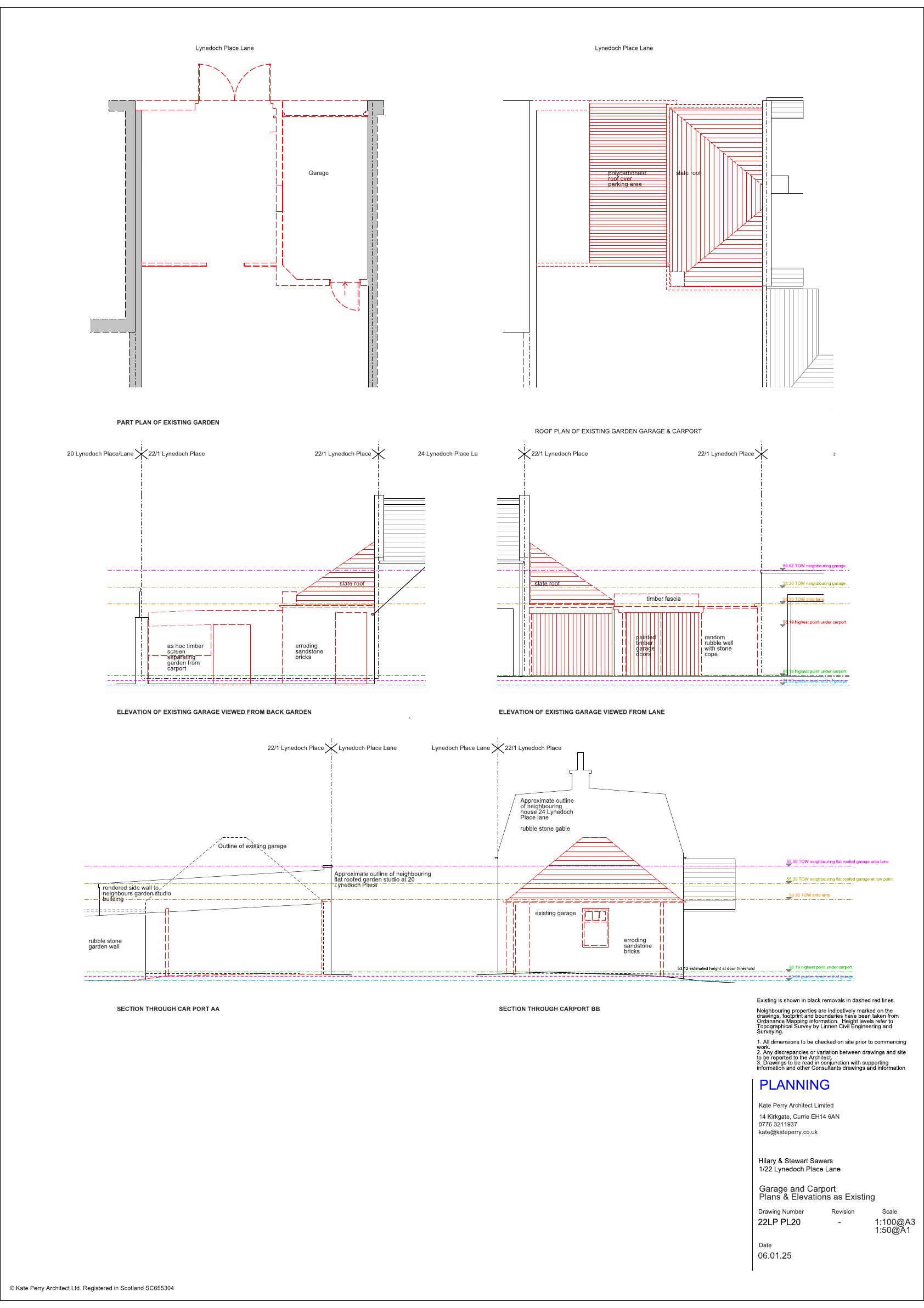 Existing garage and carport on Lynedoch Place Lane to be cleared; replacement single-storey garage incorporating greenhouse and DIY workspace plus rebuilt stone lane-facing wall. .