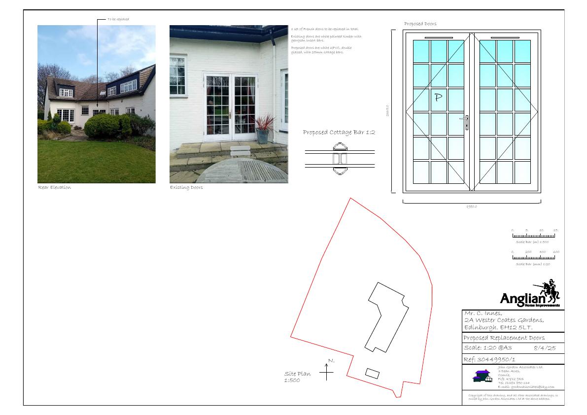 Swap timber French doors on rear of 2A Wester Coates Gardens for energy-efficient white uPVC, cottage-bar double glazing; footprint and elevations unchanged. .