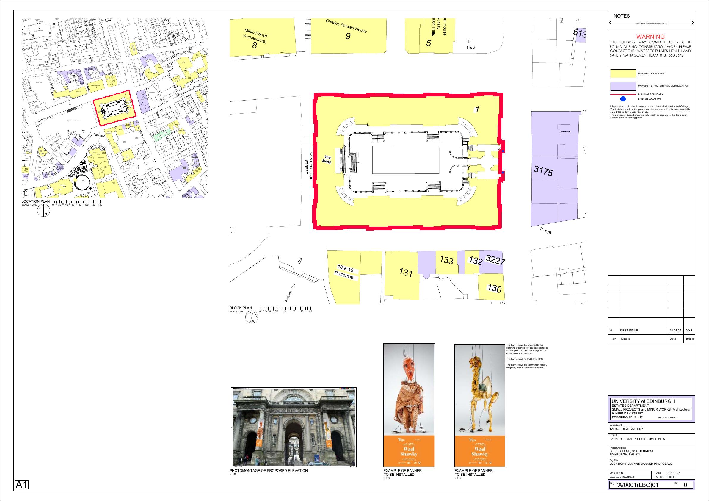 Old College faade gains temporary vertical banners on main columns for summer art show; reversible fixings, no structural impact. .