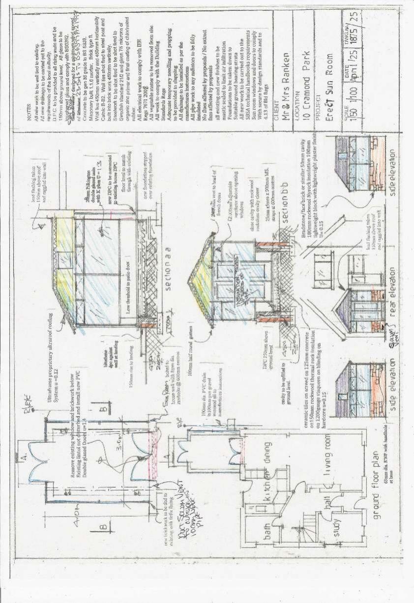 Rear single-storey sun room with glazed walls and a tiled pitched roof added to No.10 Cramond Park, modestly enlarging the lounge; no impact on street frontage or parking. .