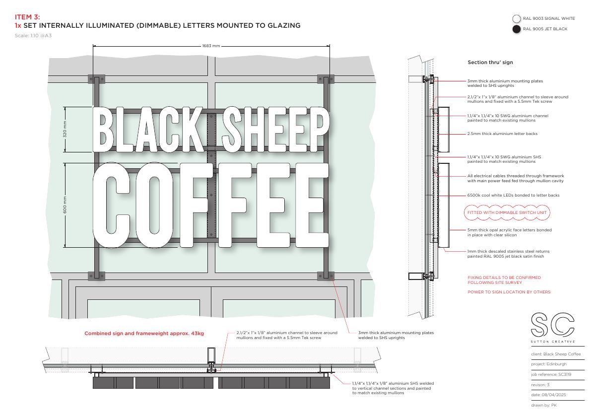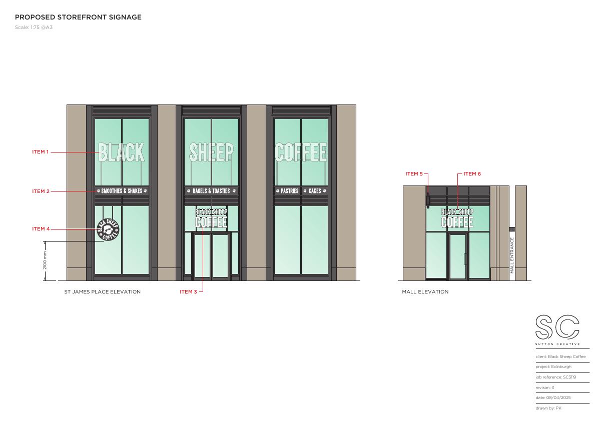 LED-lit Black Sheep Coffee fascia1.7 m 0.9 m letters plus small vinyl strips and logoapplied to glazed frontage of Unit C1.25, St James Quarter; strictly signage, no structural change.