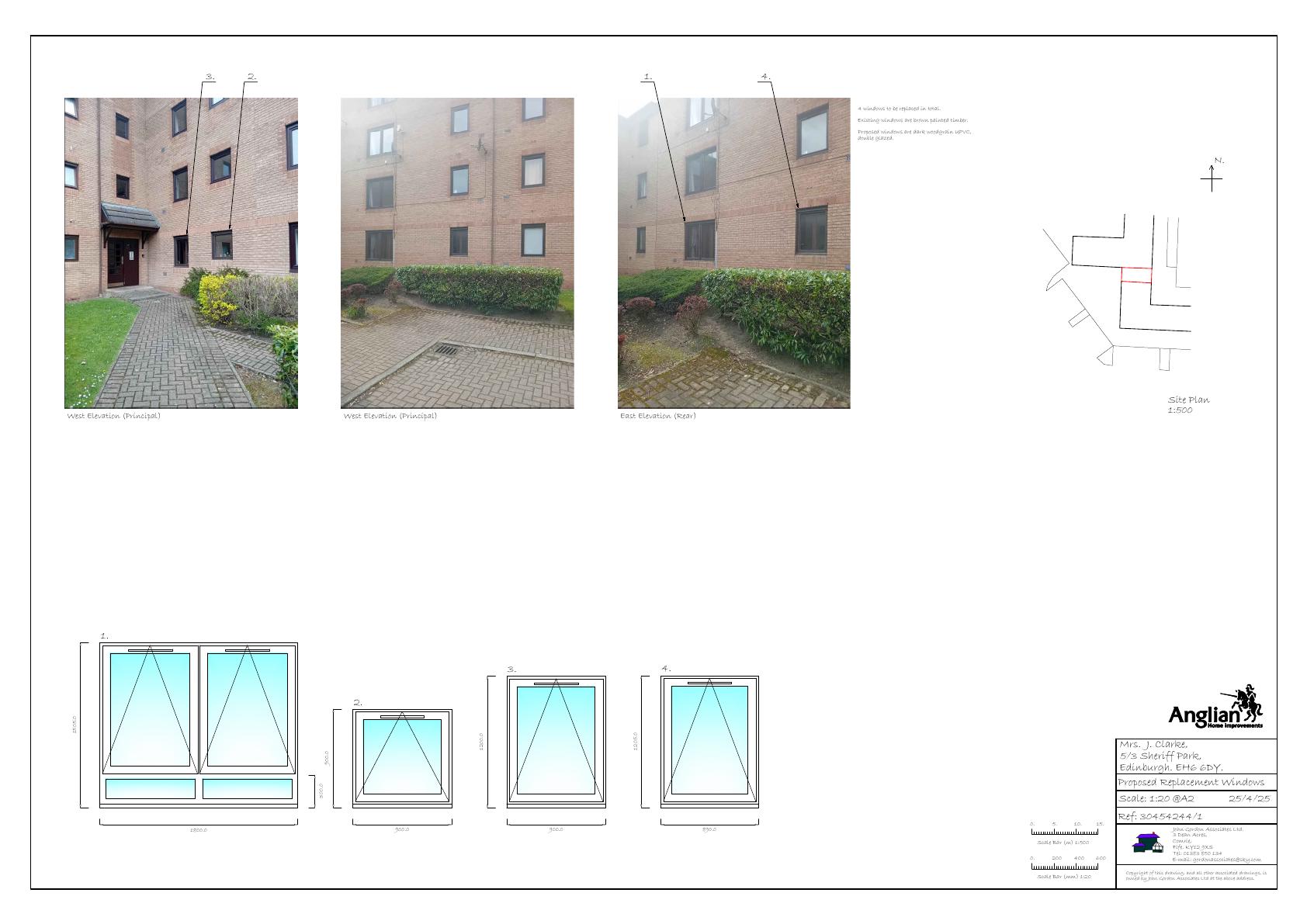 Four brown timber windows in Sheriff Park flats will be swapped for dark wood-grain UPVC replacements, same dimensions and profiles, improving durability with no change to faade layout.