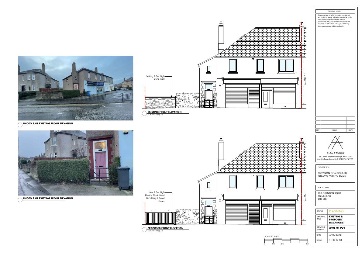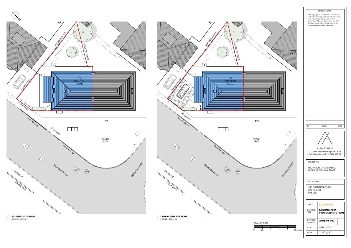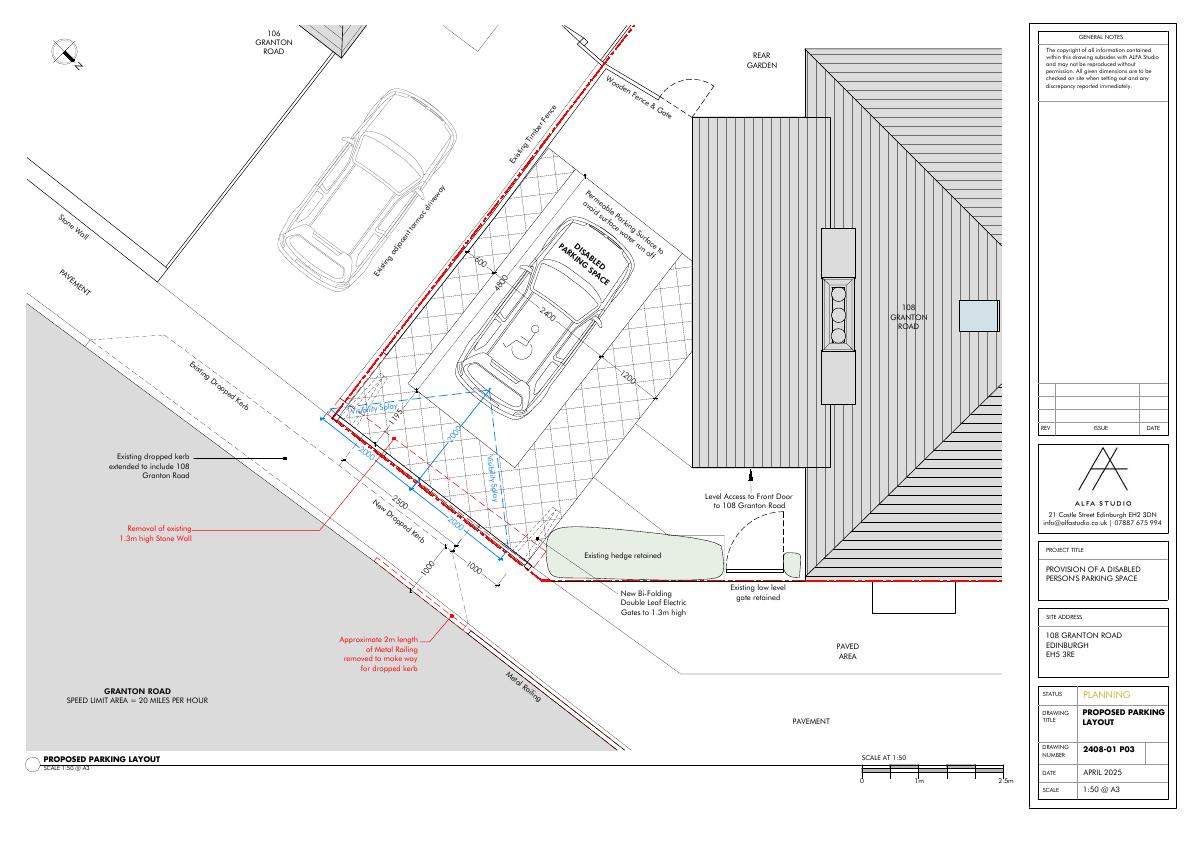 Front-garden revamp at 108 Granton Rd: remove part of 1.3 m stone wall, extend dropped kerb, add block-paved 2.5 m accessible bay with 1.3 m electric bi-fold gates and level route to door. .