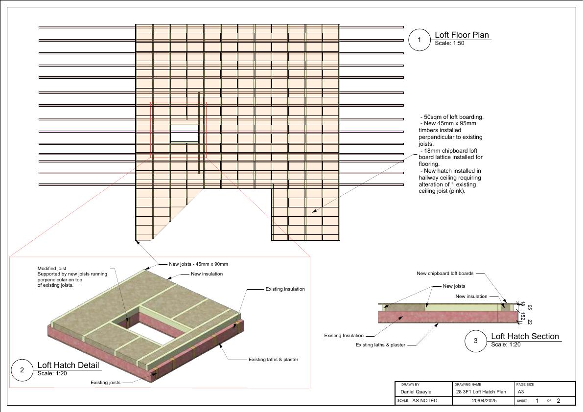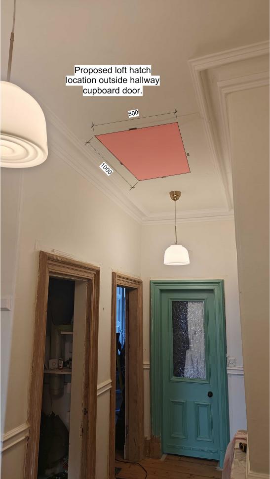 1 m 0.6 m loft hatch with pull-down ladder in hallway ceiling; single joist trimmed, loft boarded and insulated for storage only, no change to external fabric. .