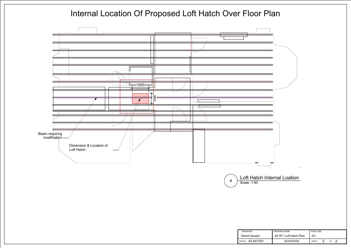 Install an internal loft hatch and ladder and insulation (from the hallway of our flat) requiring modification to existing roof beam (1) not intended for habitable space, storage only.