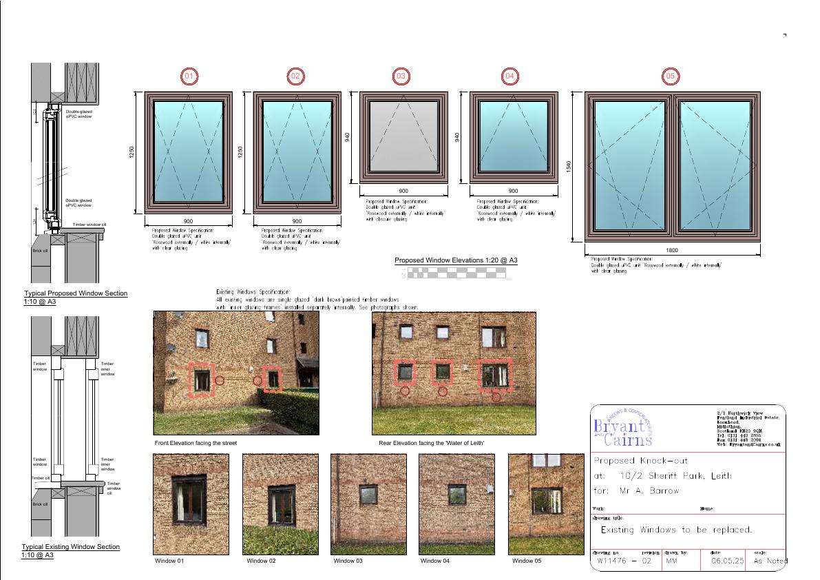 Replace five single-glazed brown timber windows on front and riverside elevations with rosewood-finish UPVC double-glazed units; openings and brickwork stay untouched. .