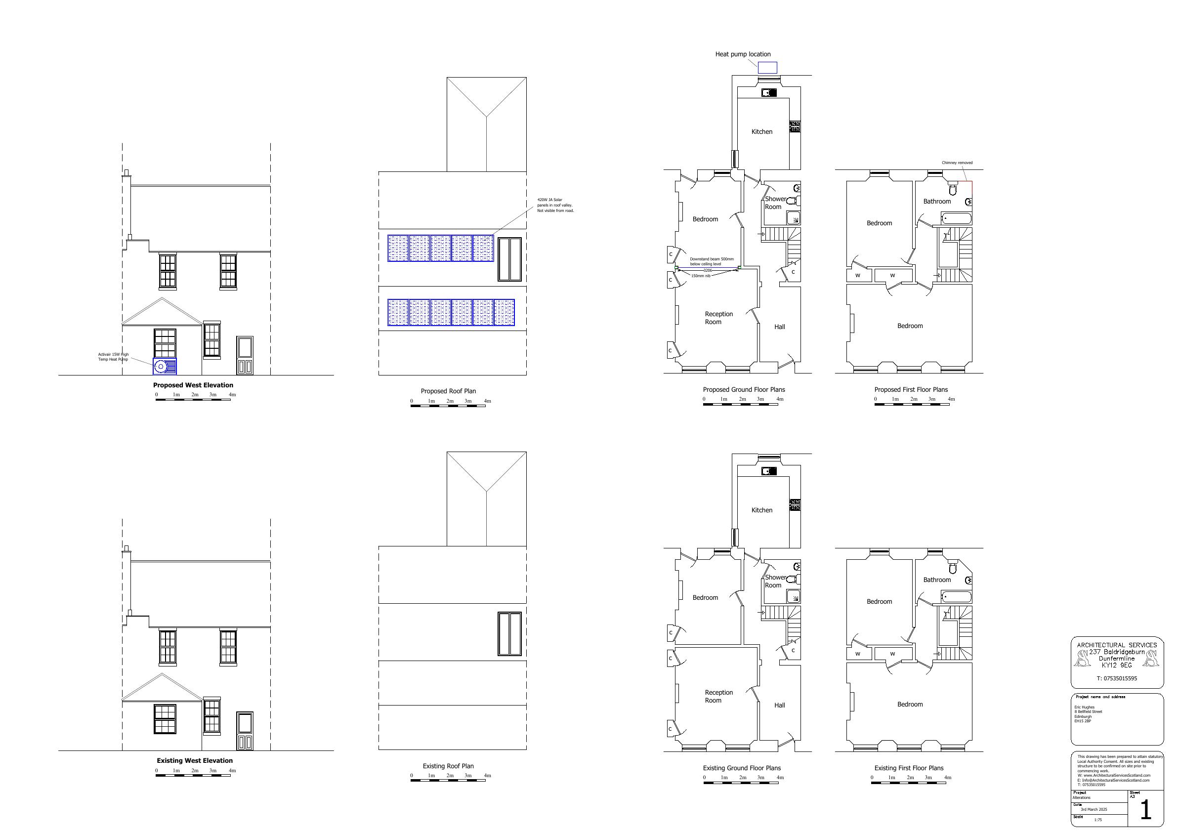 Heat pump and solar panels to exterior. Knock through reception room and bedroom wall. Downstand beam 500mm below ceiling level 150mm nibs, cornices to remain.