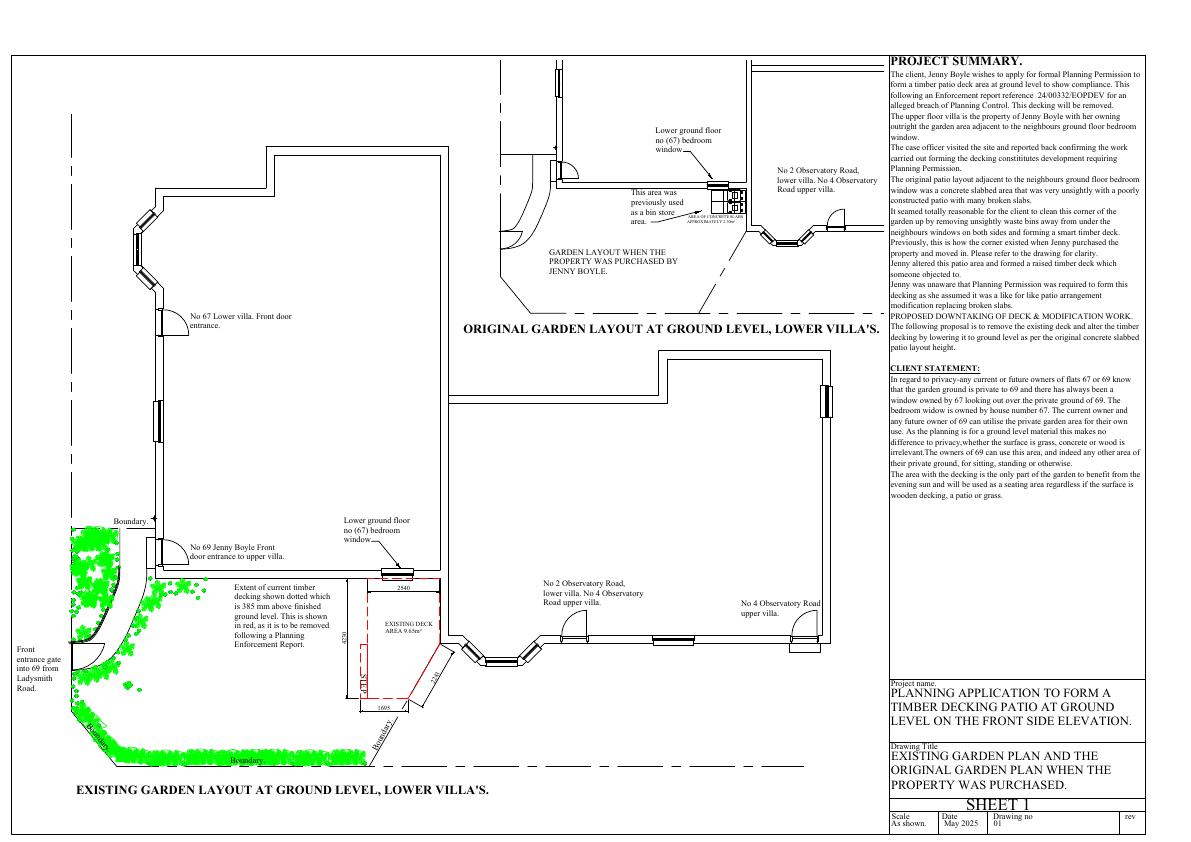 Raised timber deck removed; new ground-level patio in same footprint with modest retaining detail, improving privacy and reducing overlook. .