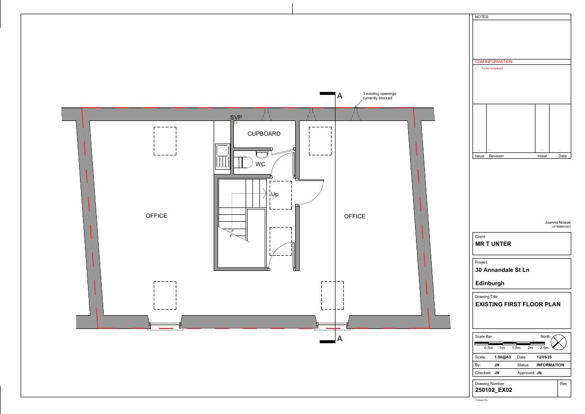 Add two rooflights to pitched roof, reopen three blocked wall openings and fit small extract vent on compact two-storey office at 30 Annandale St Lane. .