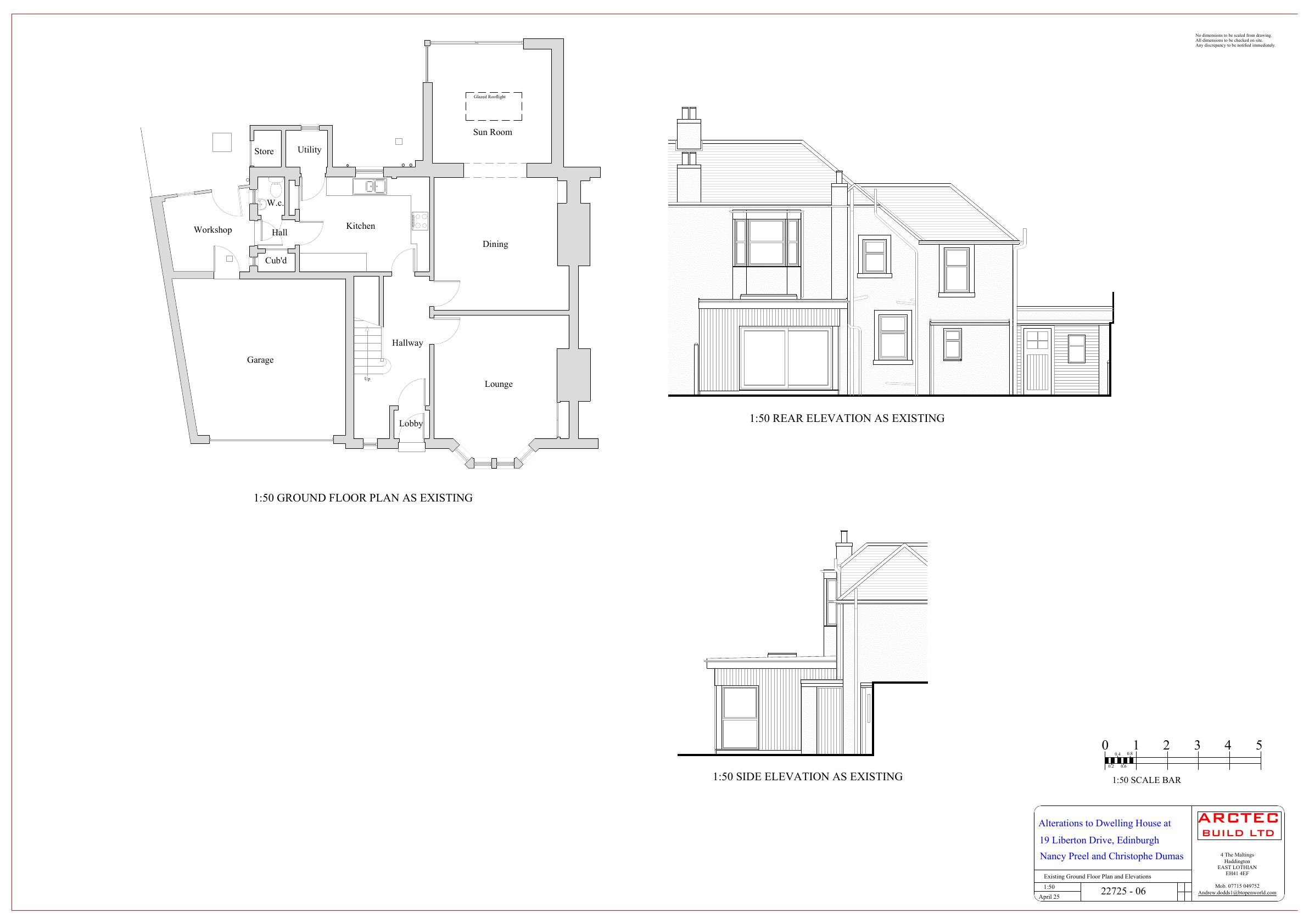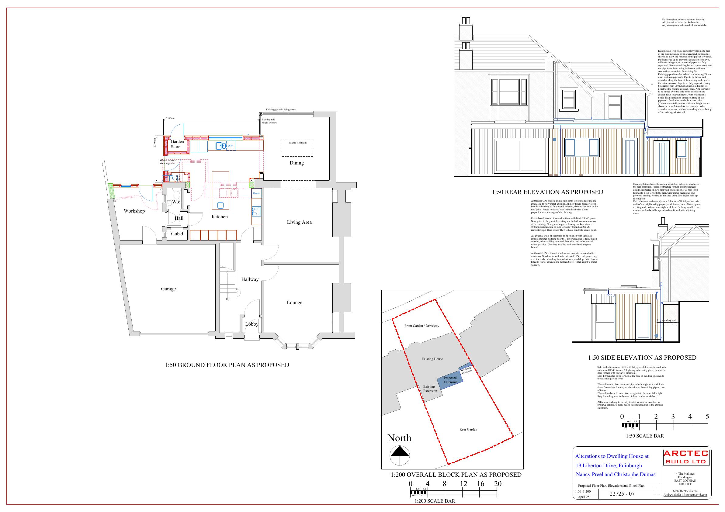 Single-storey rear addition links to the sun-room to create a larger kitchen; extra lean-to extends the workshop, all contained within the rear garden footprint. .
