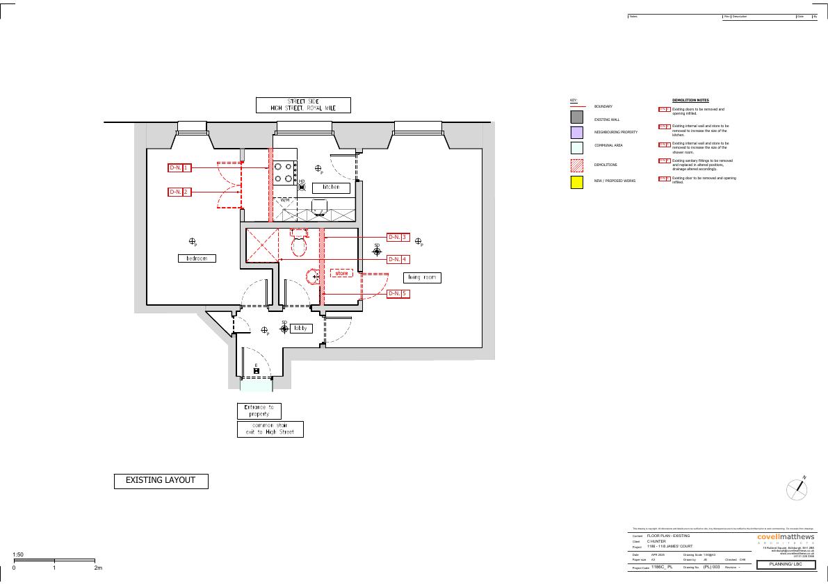 Internal re-jig of James Court flattwo stores removed, walls shifted for a wider galley kitchen and enlarged shower room; fabric and exterior untouched. .