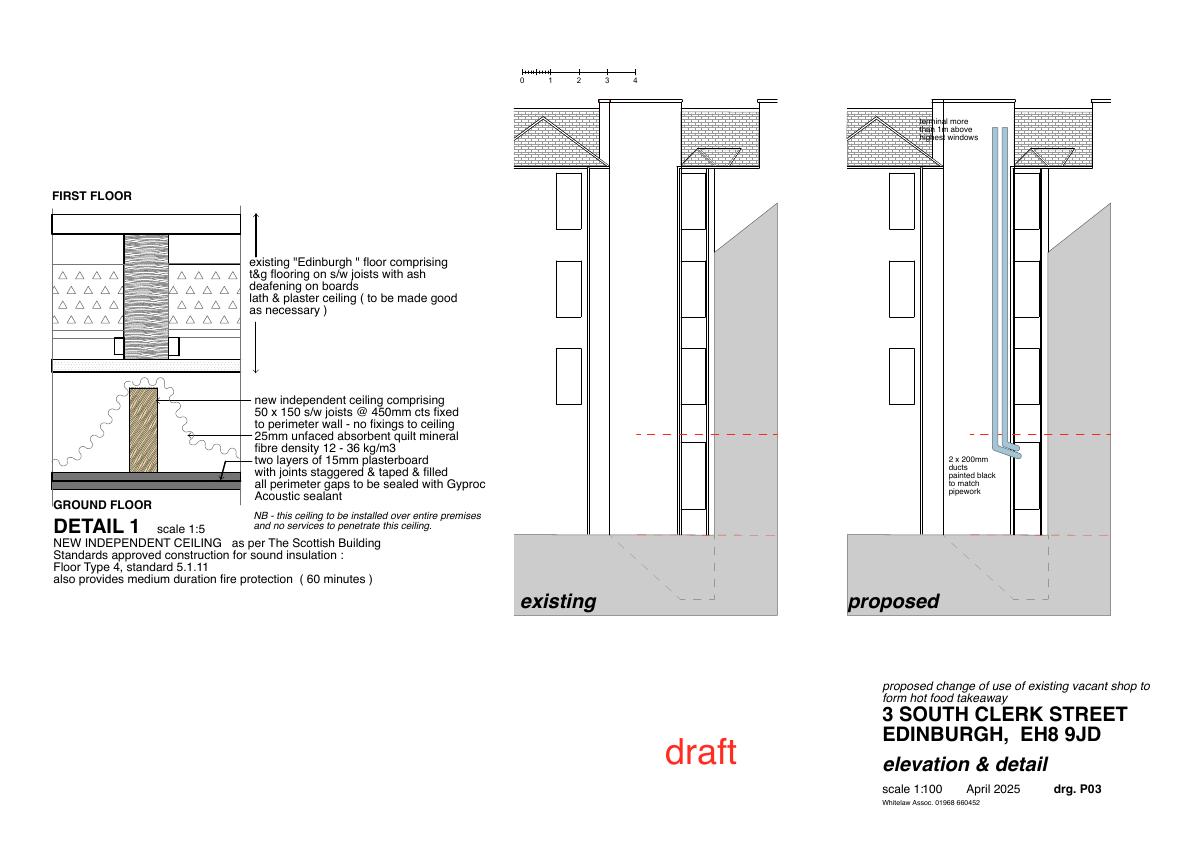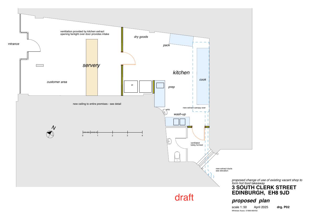 Vacant ground-floor shop at 3 South Clerk St becomes takeaway: minor partition removal, new servery, kitchen, acoustic ceiling and twin 200 mm rear extract ducts; no structural extension.