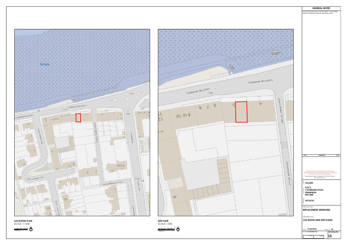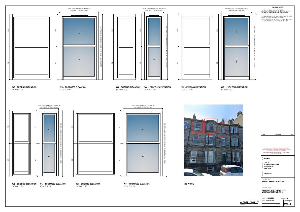 Top-floor flat at 5 Starbank Rd to swap timber sash windows for like-for-like PVCu double-glazed sliding sashes, retaining existing openings and street appearance while boosting insulation. .