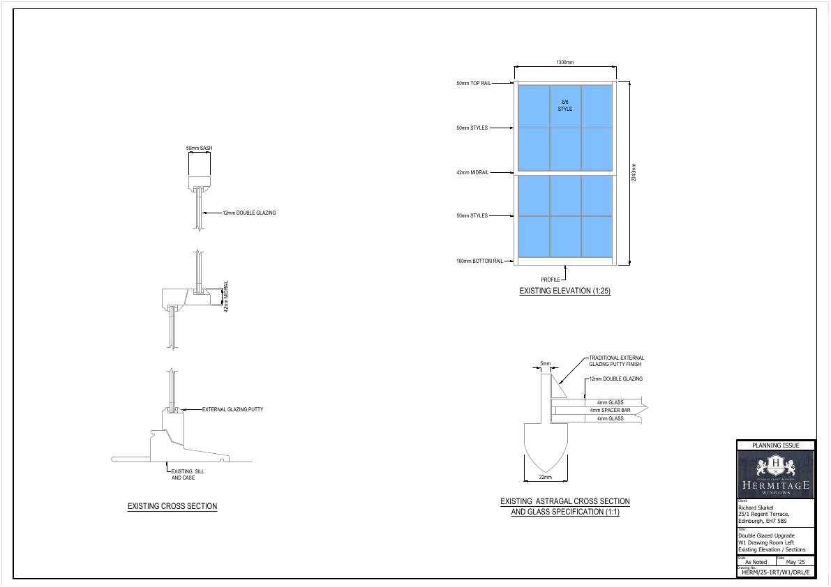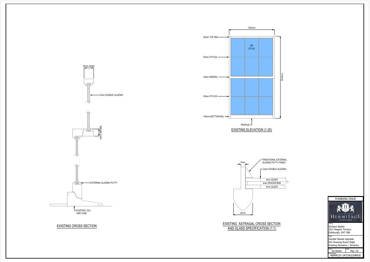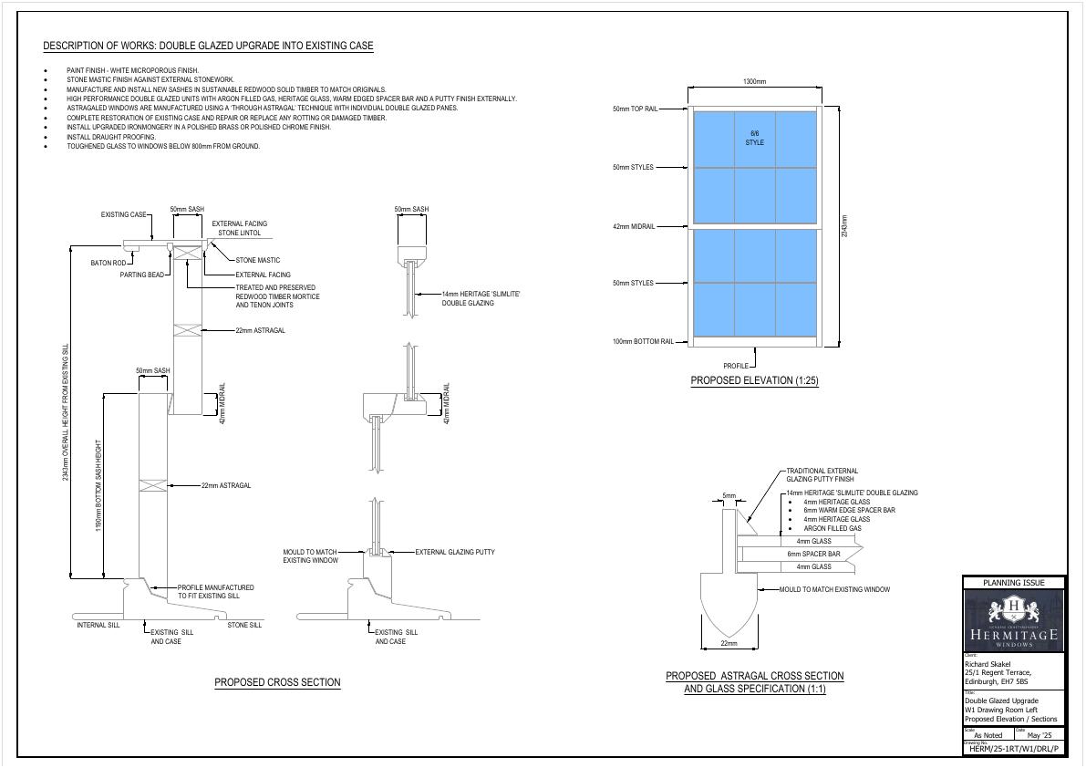 Upgrade all sash windows at Flat 1, 25 Regent Terrace: existing timber cases repaired, new like-for-like timber sashes with Heritage Slimlite double glazing; outward look unchanged. .