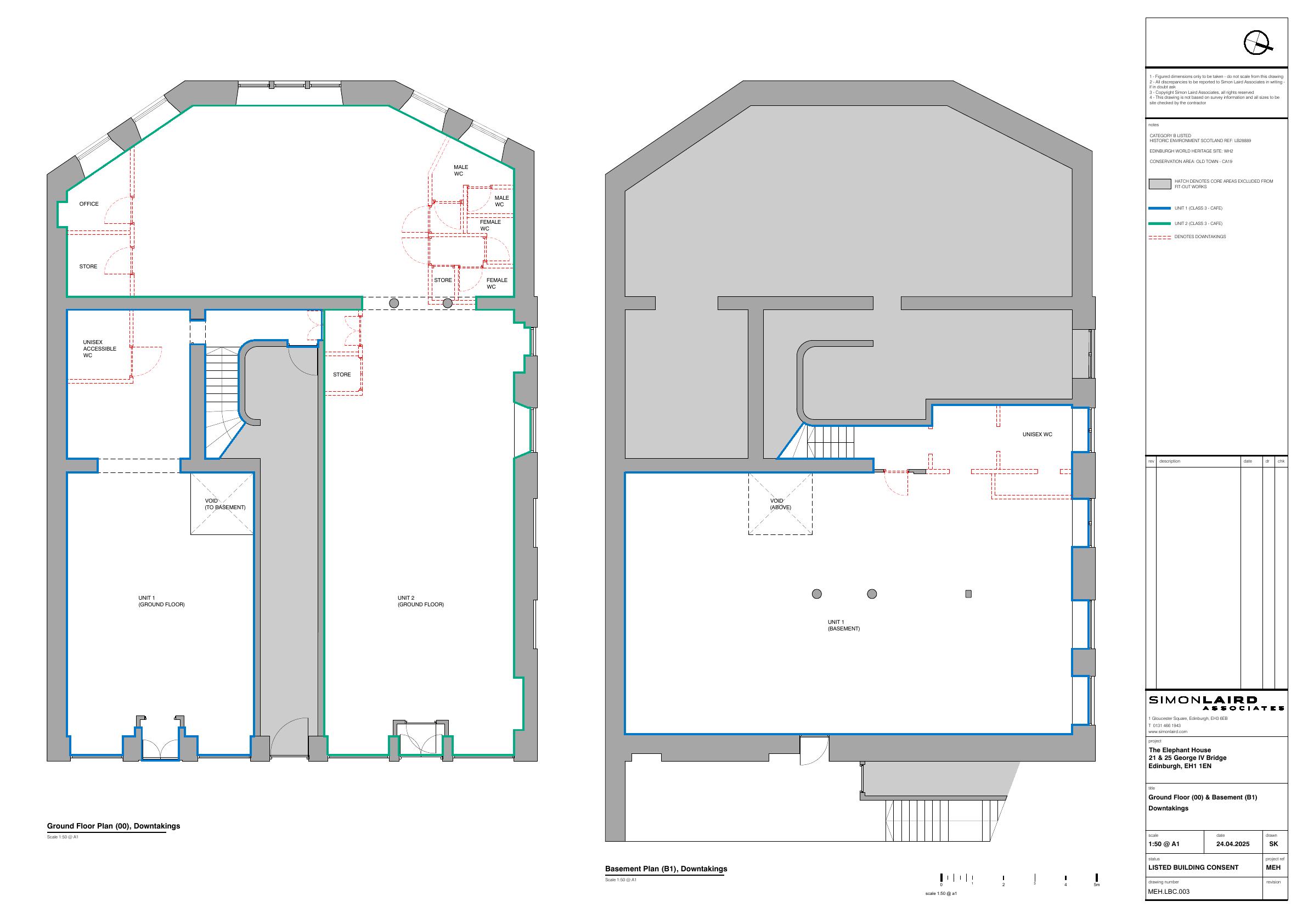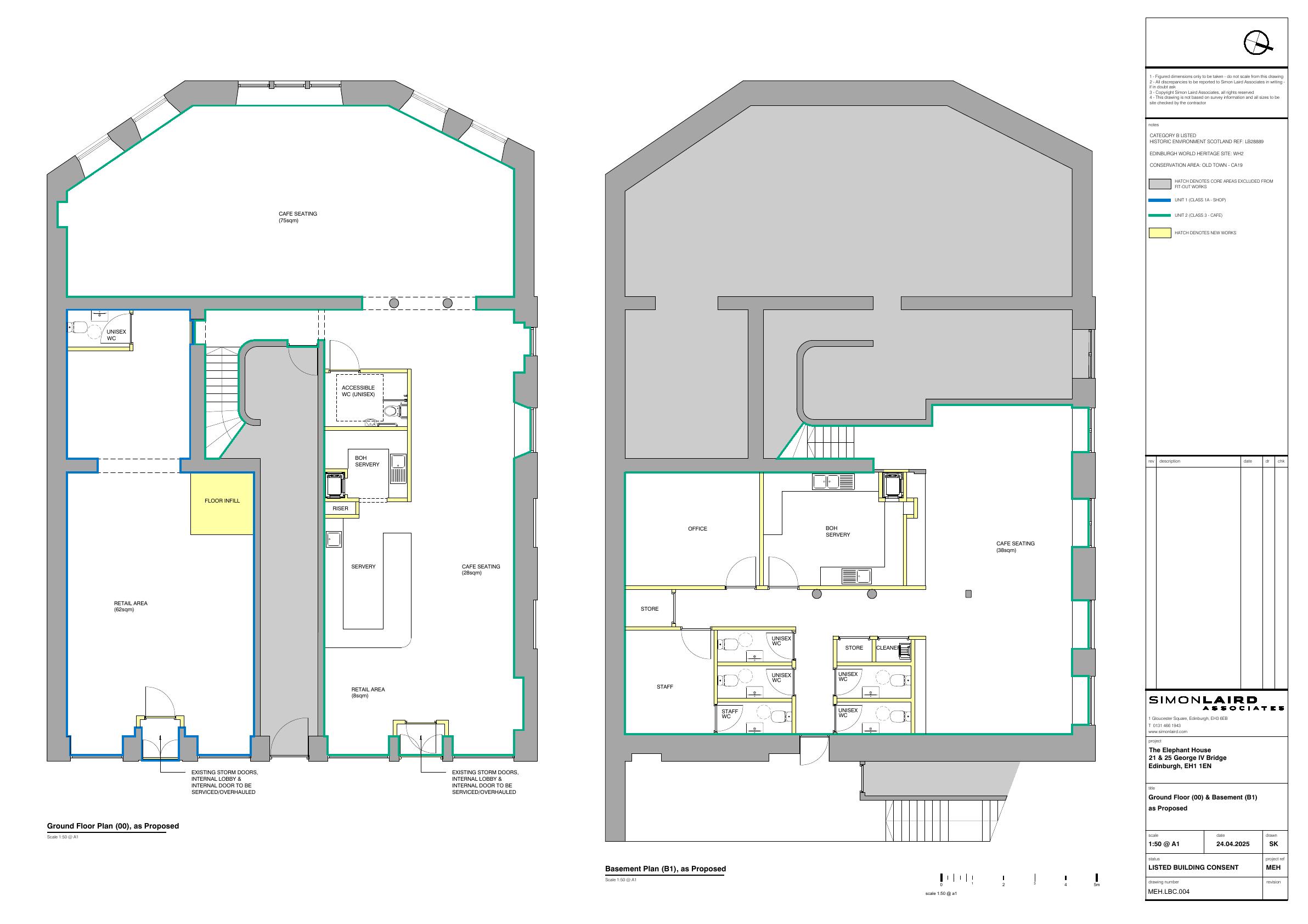 Restores listed former caf/retail at 213-215 George IV Bridge after fire; repairs faade, reconfigures ground & basement for retail/caf, new WCs, servery, staff rooms, no extensions. .