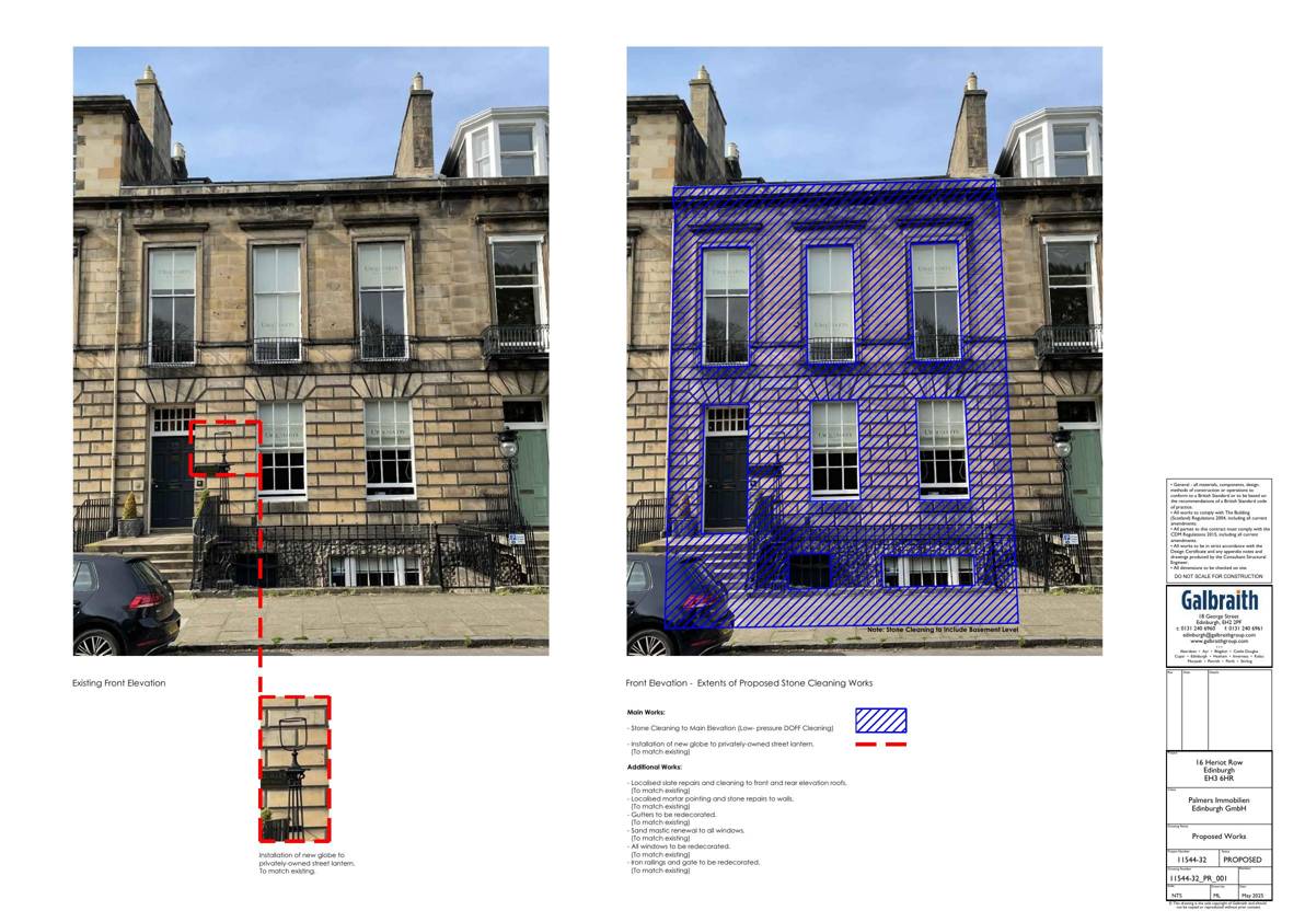 Low-pressure DOFF clean of whole front faade at 16 Heriot Row, with targeted repointing, stone repairs and new basement stair grille; fabric only, no change to layout or height.