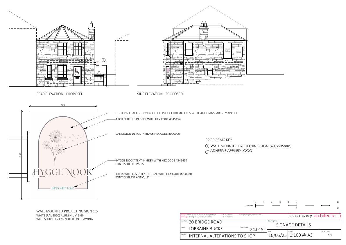 Install 400535 mm white aluminium projecting sign plus window vinyl logo for Hygge Nook gift shop at 20 Bridge Road; no structural change. .