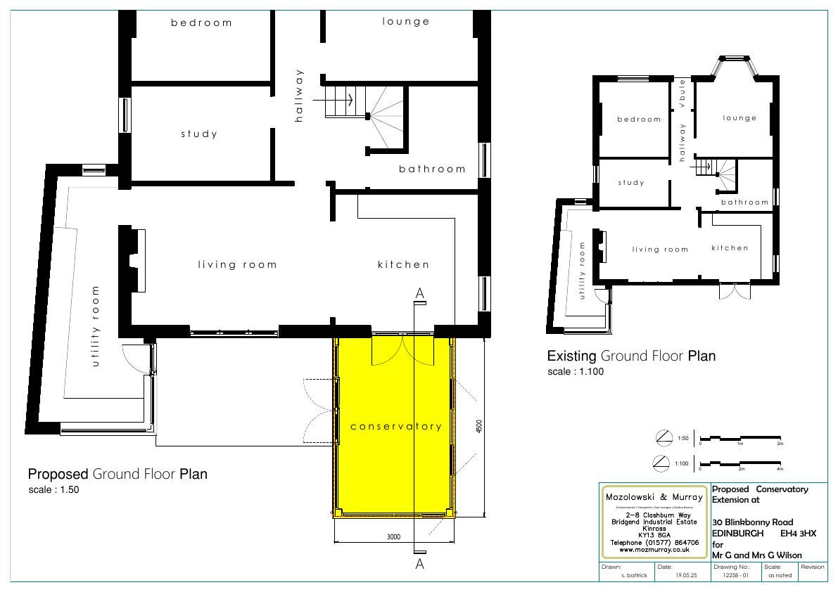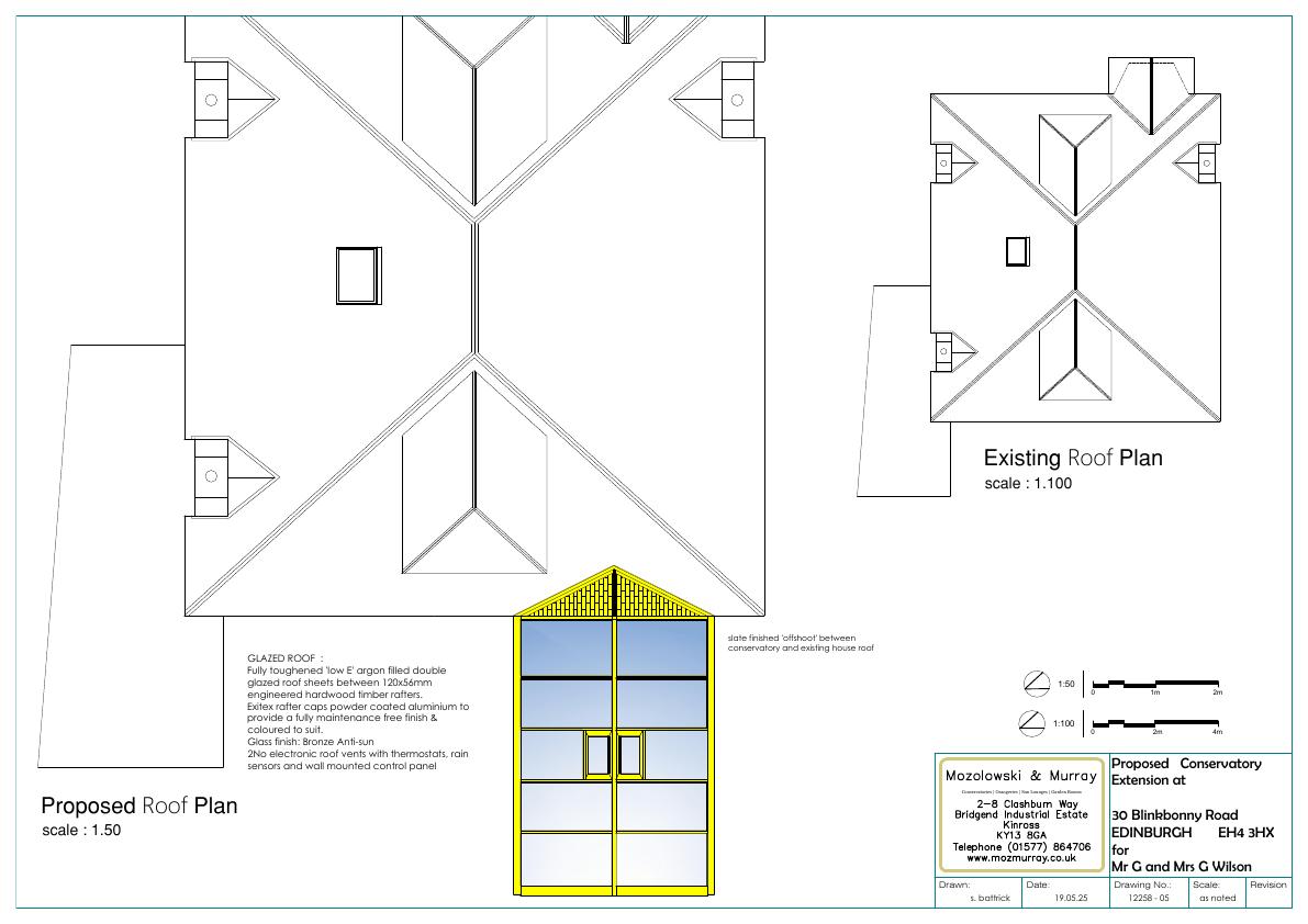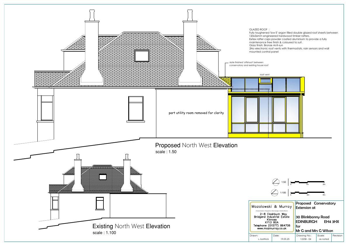 Rear of 30 Blinkbonny Rd to gain a 3 m 4.8 m hardwood glass conservatory with bronze anti-sun roof and automated vents; single-storey, screened from street, low neighbour impact. .